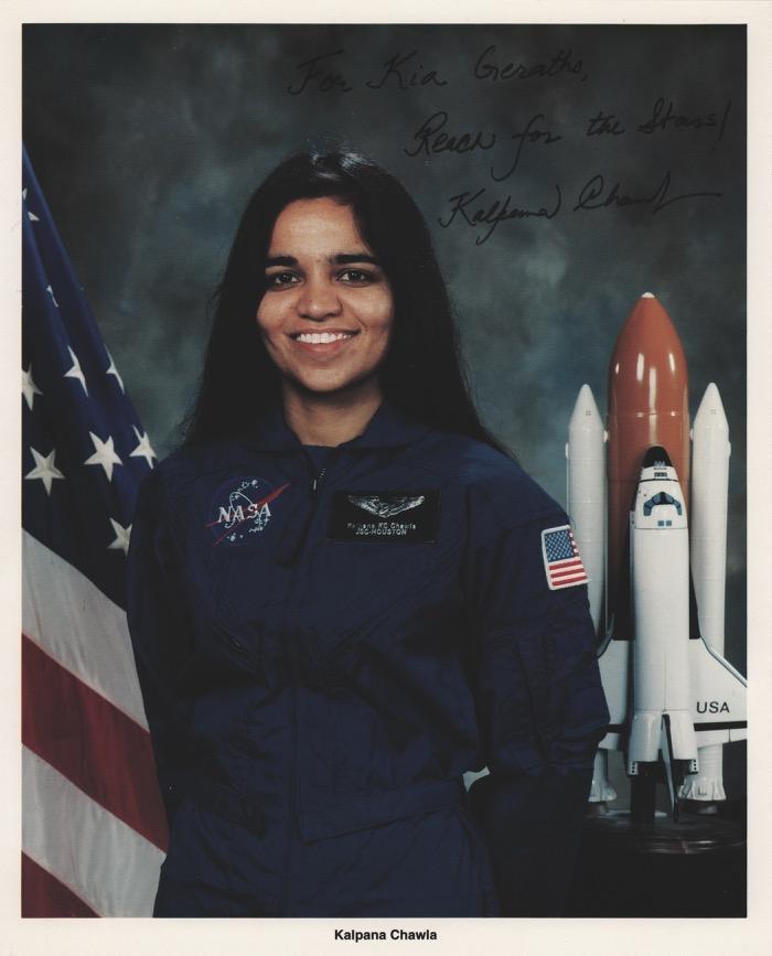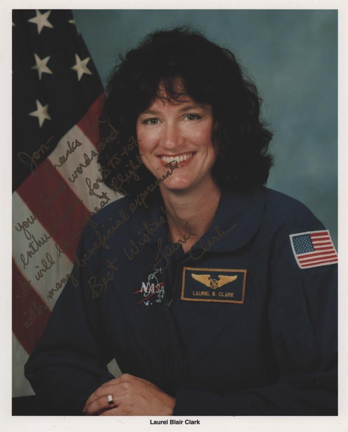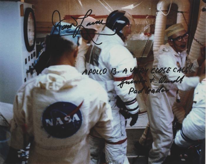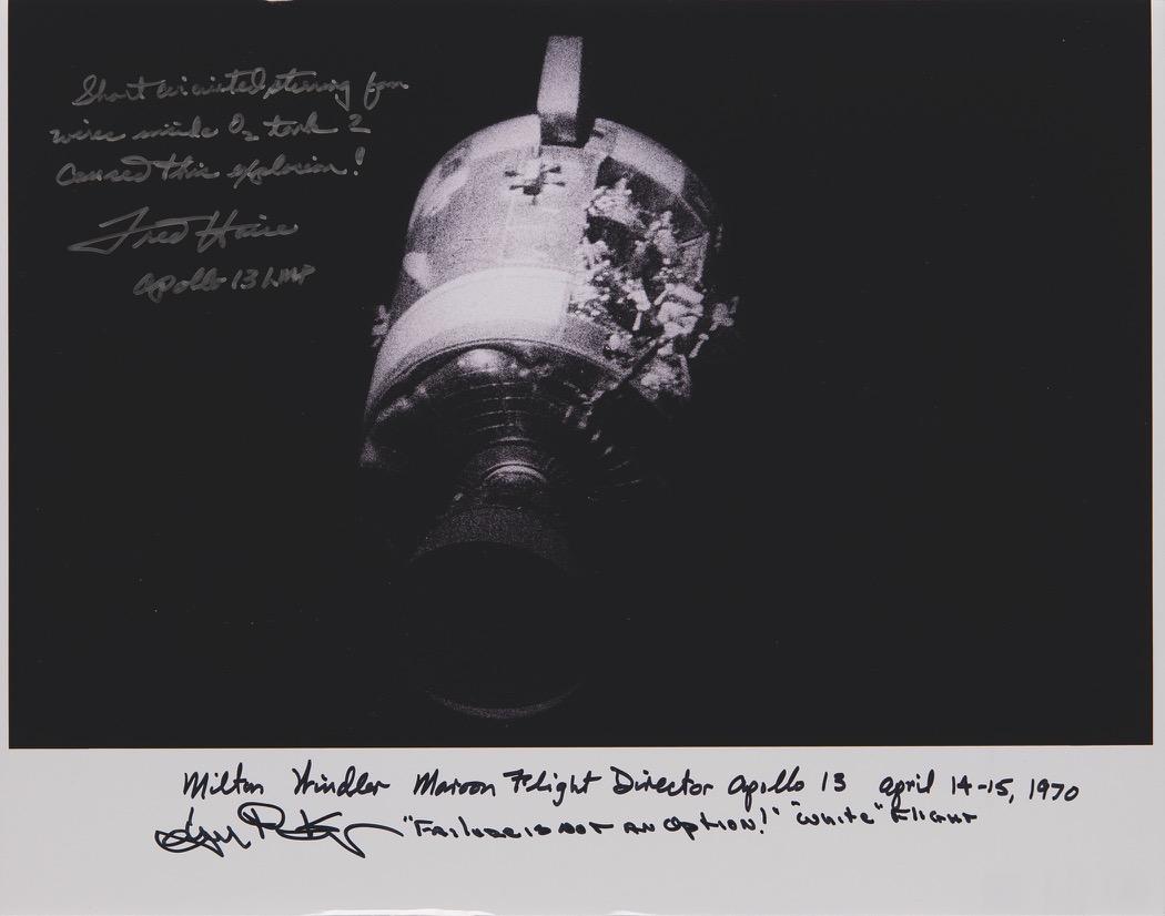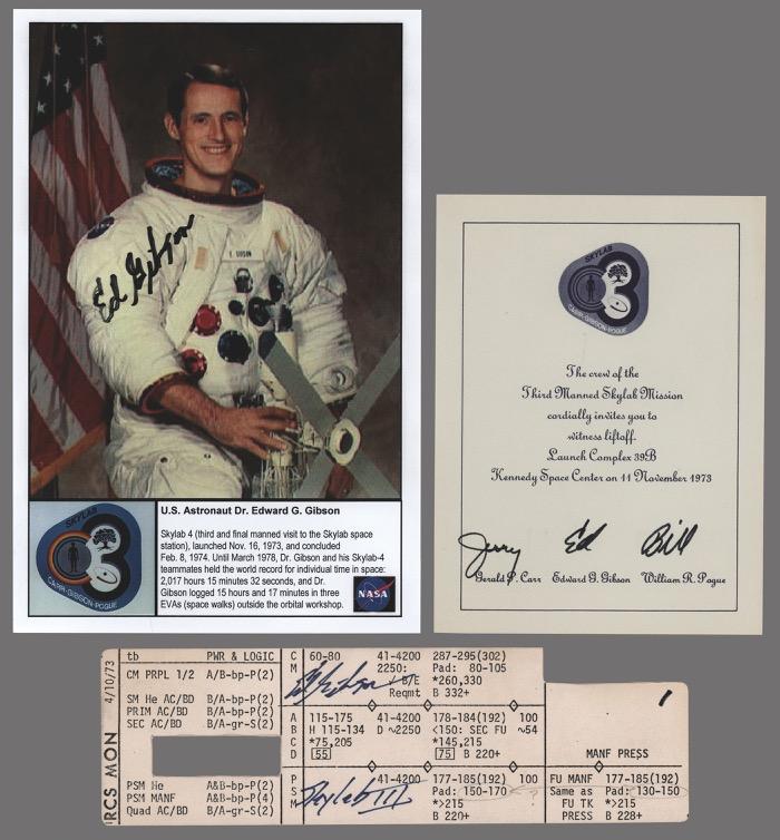 6121. Apollo 1 Signed Photograph with Rare Flight Suit Patches of Gus Grissom and Ed White II. Extremely rare official color glossy 9.75 x 7.5 red-numbered NASA photo of the Apollo 1 crew in their blue flight suits, signed and inscribed in black felt tip, “To Joyce – Thanks for all your help at KSC – with best wishes, Edward H. White II,” “Gus Grissom,” and “Roger B. Chaffee.” Includes two leather NASA identification tags from the flight suits of Grissom and White, “V. I. Grissom, M.S.C. N.A.S.A.” and “E. H. White, M.S.C. N.A.S.A.,” who wore these ID tags during trips to and from the Kennedy Space Center. All items are framed together with a commemorative patch and caption plate to an overall size of 23.25 x 18.25. In overall fine condition, with slightly trimmed edges, and some scattered small creases, one of which touches Chaffee’s cheek; the name tags exhibit moderate to heavy wear. Accompanied by a letter of provenance from Joyce Abrams, who served as the crew quarters attendant for the astronauts, in part: “The two leather uniform name patches for the Apollo 1 astronauts…are the original patches from the astronauts’ flight suits which were worn by them while flying into and out of Kennedy Space Center during Pres. John F. Kennedy’s Man to the Moon program.” Starting Bid $1000