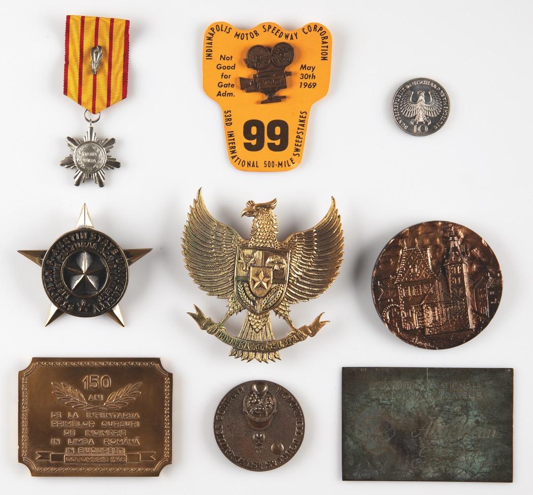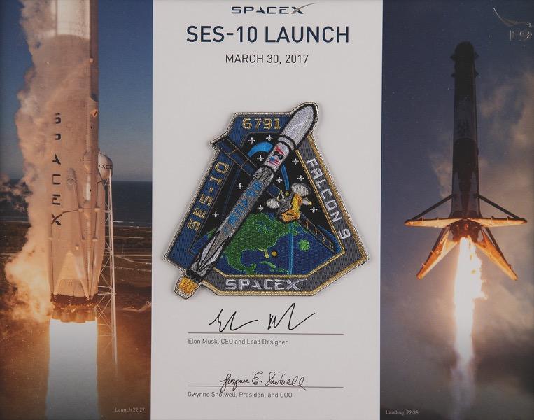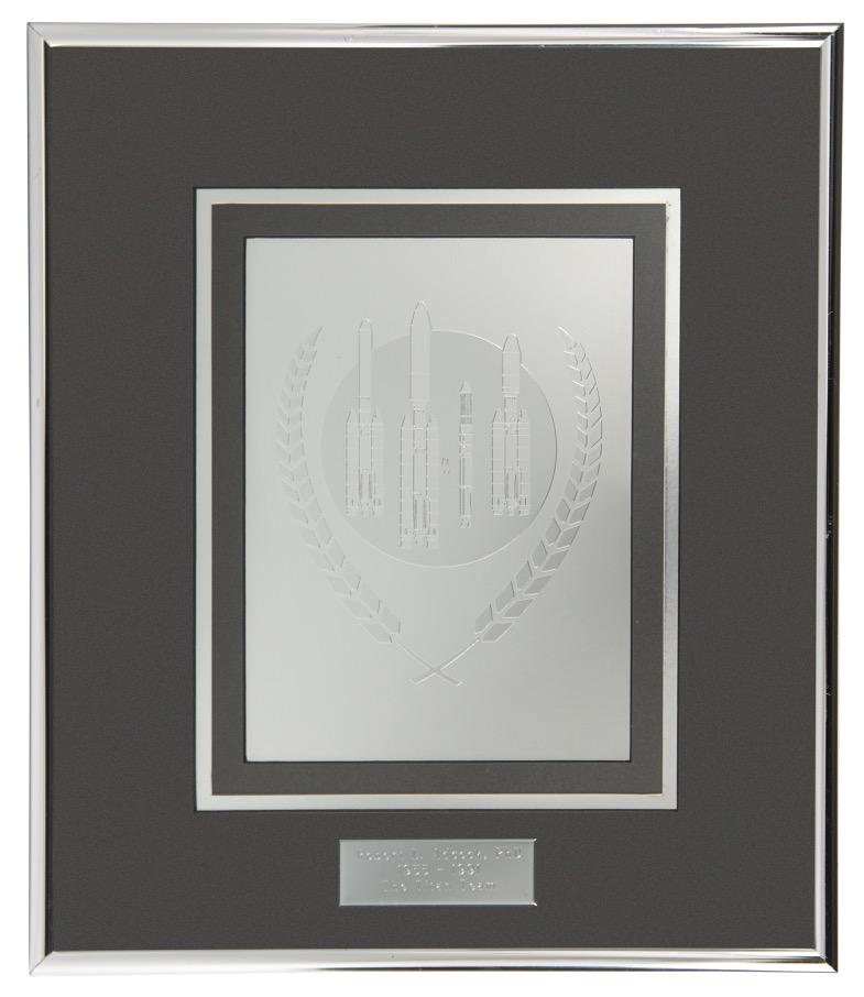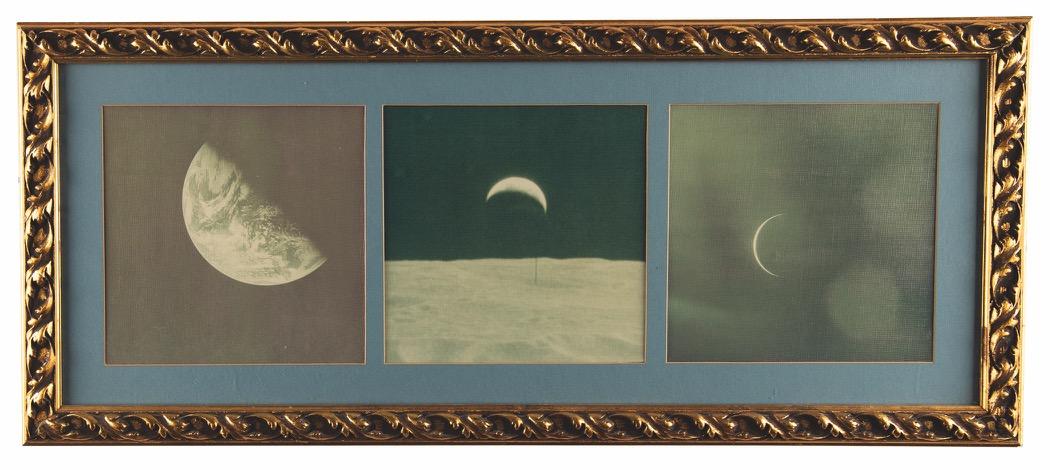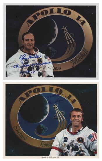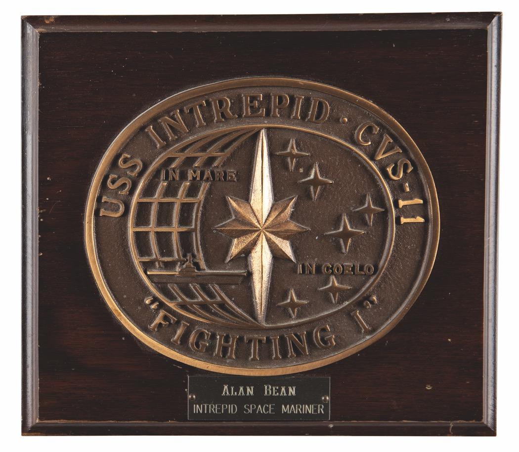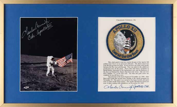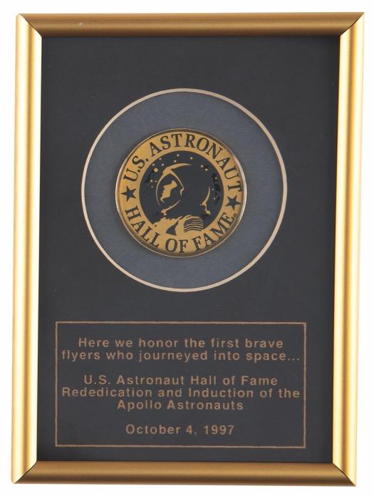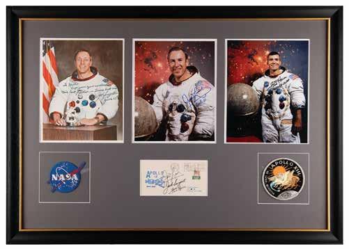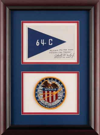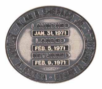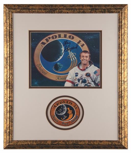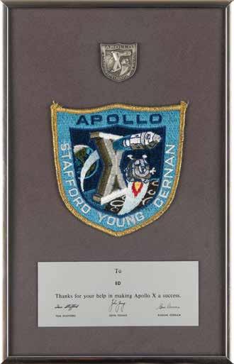 6109. Apollo 10 Flown Robbins Medallion and CrewPresented Patch Display - From the Personal Collection of Edgar Mitchell. Edgar Mitchell’s flown sterling silver Apollo 10 Robbins medallion, measuring approximately 1.25˝ x 1.25˝, featuring a raised design of the shield-shaped mission insignia on the face—a Roman numeral “X” towering over the lunar surface, with the CM and LM in orbit, with the crew’s surnames in the border: “Stafford, Young, Cernan.” The reverse is presumed engraved with the mission dates, “May 18–26, 1969,” and serial number, though not visible. Condition is mint state. Mounted above an embroidered Apollo 10 ‘Grumman’ crew patch and a presentation plaque, engraved: “To Ed, Thanks for your help in making Apollo X a success. Tom Stafford, John Young, Eugene Cernan.” Framed to an overall size of 7 x 11. In fine condition. Mitchell was designated as backup Lunar Module Pilot for Apollo 10. All 300 Robbins medallions struck for Apollo 10 were flown to the moon on the ‘dress rehearsal’ mission, giving them the unique distinction of being part of a Guinness World Record—on its return from the moon, Apollo 10 set the record for the highest speed attained by a manned vehicle: 24,791 mph (39,897 km/h) or Mach 36! Accompanied by a letter of authenticity from Karlyn Mitchell, the daughter of Edgar Mitchell. Starting Bid $300