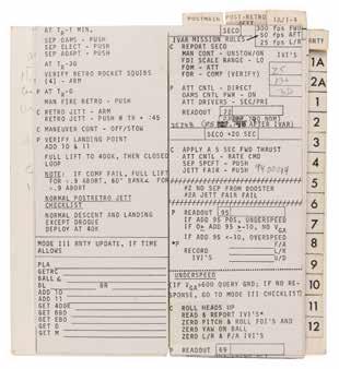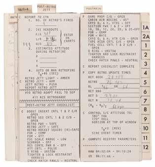 6033. Gemini 12 Flown Checklist Signed by James Lovell. Scarce flown Gemini 12 checklist used on the mission by Command Pilot James Lovell, identified on the front as “CF 55047-9, S/N 112, Remarks: Checklist,” and signed and flight-certified in black ballpoint, “Gemini 12, James Lovell, Gemini 12, Flown onboard Gemini 12.” The tape-bound 3.75 x 8.5 checklist contains 20 double-sided pages plus stiff covers, with tabbed sections labeled “1A/1-4,” “RNTY,” “Post-Retro Jett,” and “Postmain.” It features numerous pencil notations inside in Lovell’s own hand, with a list of instructions related to drinking water written inside the front cover. Other notations record critical flight metrics such as IVI values, wind and altitude data, coordinates, and other readouts. One ink notation designates settings for the 16mm camera: “f8, 1/250, 1 Frame/Sec.” The rear board bears an affixed Velcro strip for securing the checklist within the Gemini spacecraft. In very good to fine condition, with light soiling and overall wear from use. Starting Bid $1000