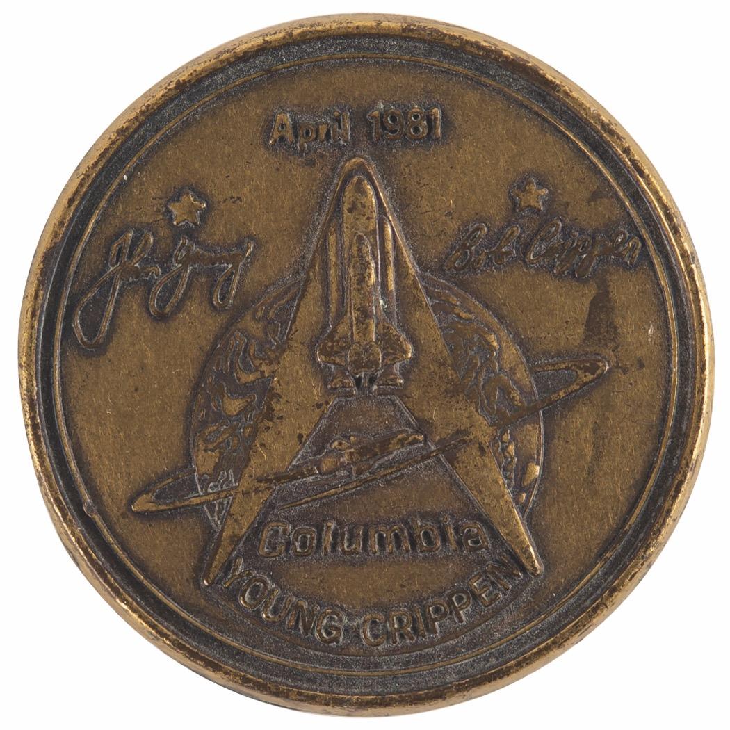 6067. Apollo 1 Gold-Plated Fliteline Medallion - From the Collection of Bailey K. Howard. Unflown gold-plated Apollo 1 Flightline medallion commemorating the tragic mission, approximately 1.25˝ in diameter, with a raised design of the mission insignia on the face, and raised text of the astronauts’ surnames and mission on the reverse. Condition is mint state, with noticeable fading to the gilt plating, a bit of tarnishing to edges, and an area of toning to reverse. A historic medallion, one of a limited number prepared for flight on Apollo 1, that never reached its destination due to the tragedy. RR Auction confirms that this unflown Apollo 1 Fliteline medallion was professionally tested by a Thermo Scientific Niton machine, which detected the presence of gilt plating. From the collection of Bailey K. Howard, the originator of the Fliteline medallions. Starting Bid $200