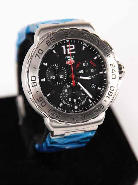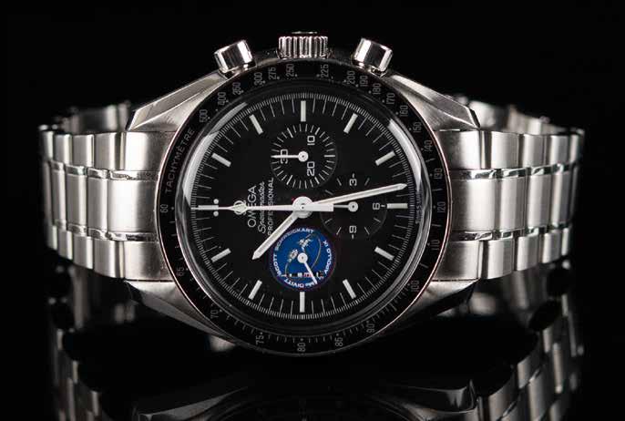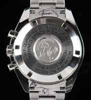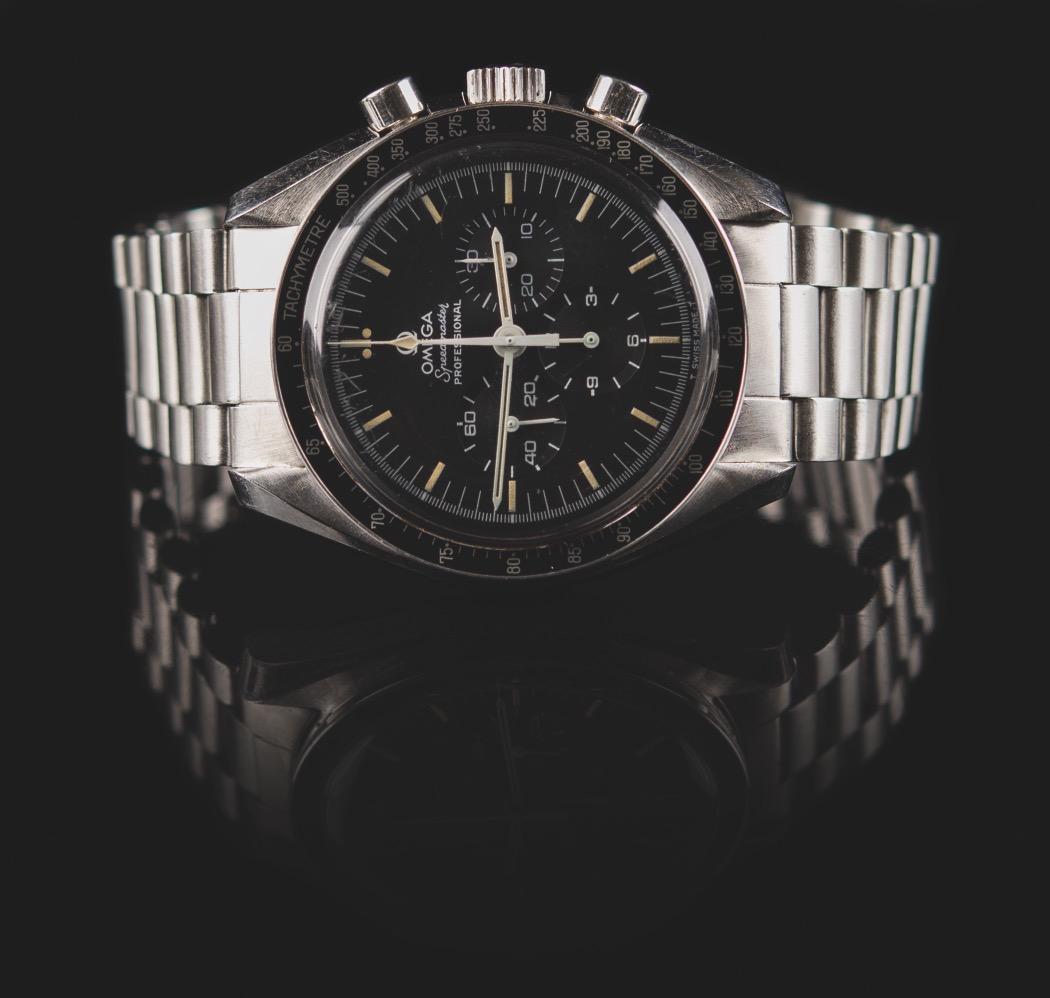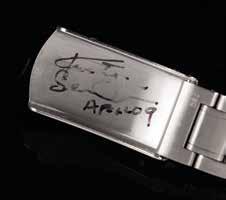 6098. Rusty Schweickart: Omega Speedmaster Professional Missions ‘Apollo 9’ Wristwatch. Limited edition Omega Speedmaster Professional Missions Apollo IX wristwatch, serial number 48381383, signed on the back of the buckle links in thin black felt tip by the Lunar Module Pilot of the Apollo 9 mission, “Rusty Schweickart, A9,” who signs again on the inner clasp, “Rusty Schweickart, Apollo 9.” Powered by a caliber 1861-based movement, this stunning timepiece is a black-faced, stainless steel chronograph, manual wind wristwatch with a Hesalite crystal, solid case back, anti-vibration and anti-magnetic dust cover, black tachymeter bezel and sub-dials, with one featuring the Apollo 9 mission insignia. Engraved on the case back is “Flight-Qualified by NASA For All Manned Space Missions / The First Watch Worn on the Moon.” This rare limited edition watch includes its original ‘Omega Speedmaster Missions’ Beta cloth case, International Warranty card and tag, Speedmaster Mission booklet, and Operating Instructions (OI) booklet with red wallet, with all but the OI booklet signed in black ink or felt tip by Schweickart, who adds his mission and/or designation to each, “Apollo 9 LMP.” In fine condition, with varying degrees of wear to the accompaniments. Starting Bid $1000