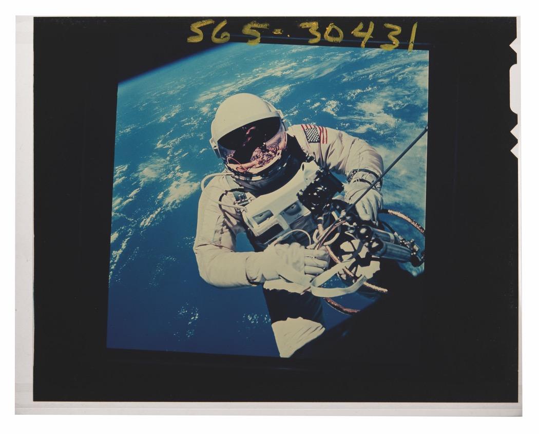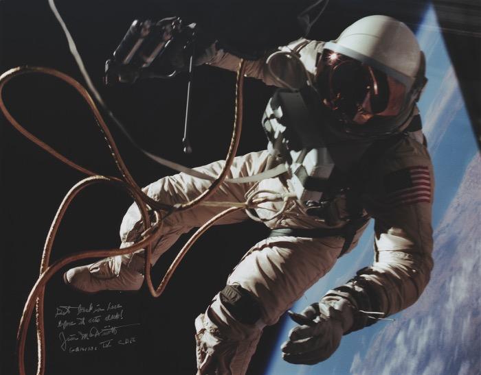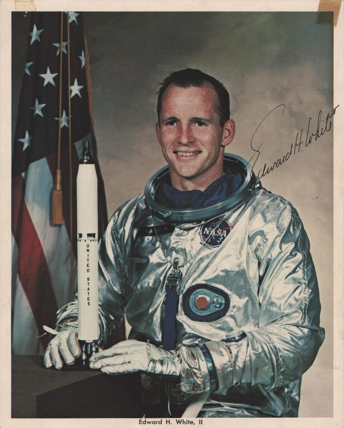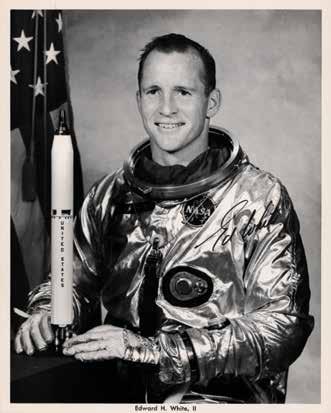 6070. Edward H. White II Signed Photograph. Choice official 8 x 10 NASA lithograph of White posing with a model rocket, nicely signed in black felt tip, “Ed White.” In very fine condition. Starting Bid $200