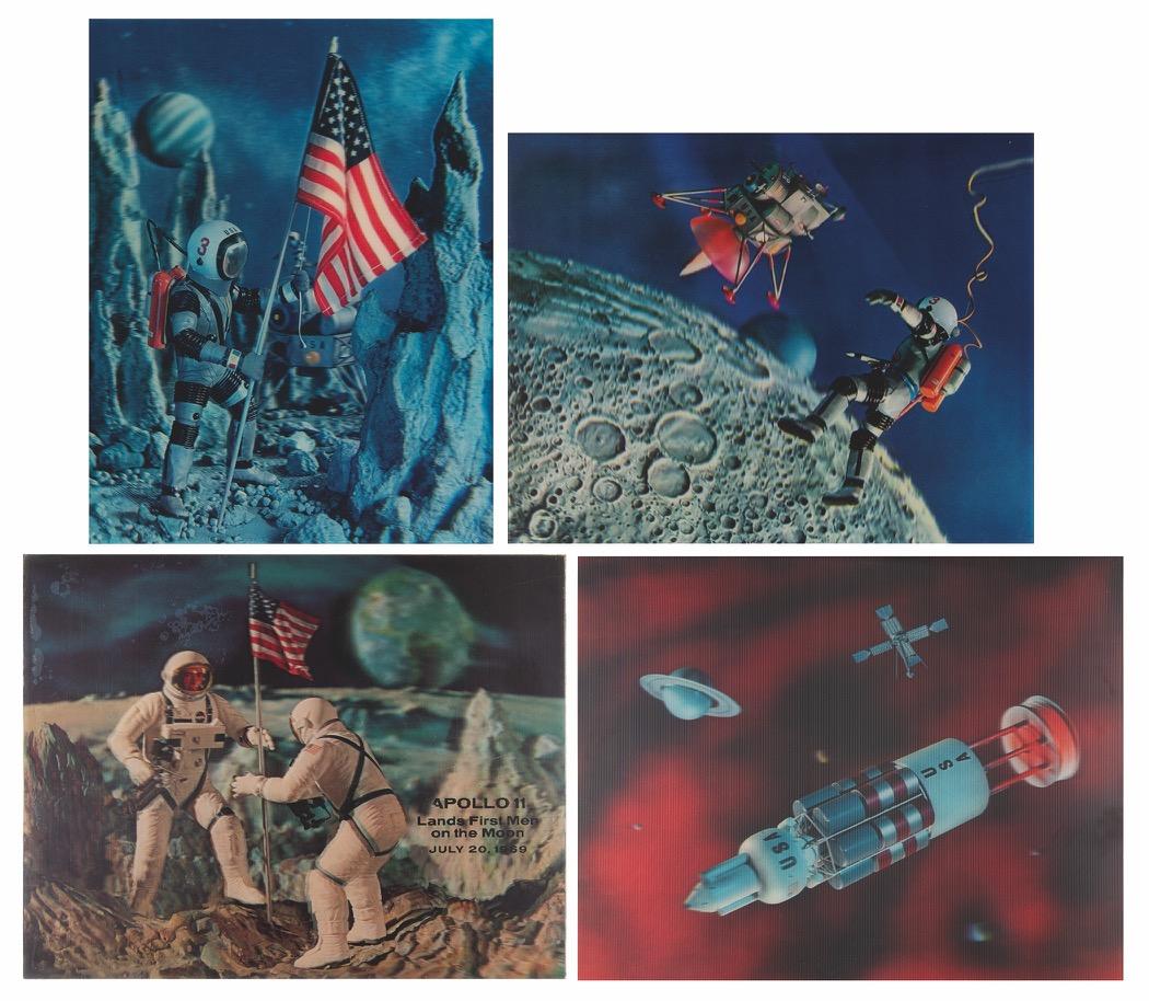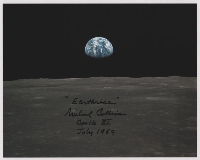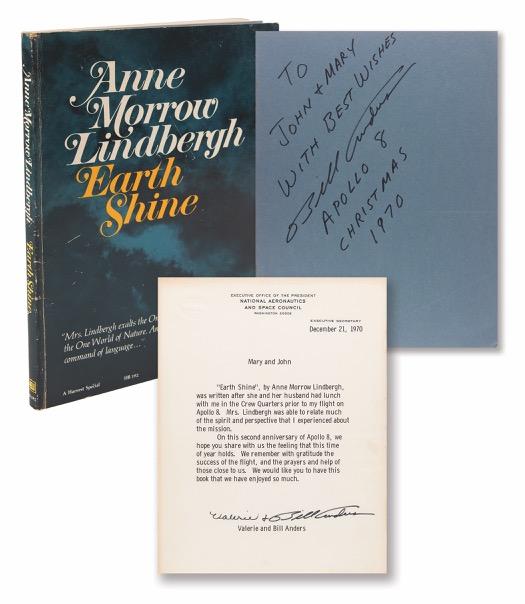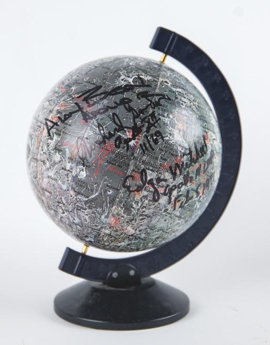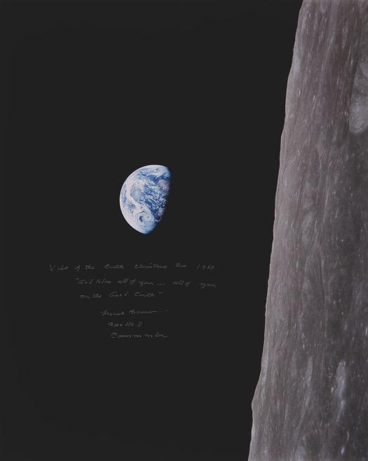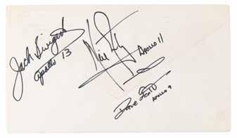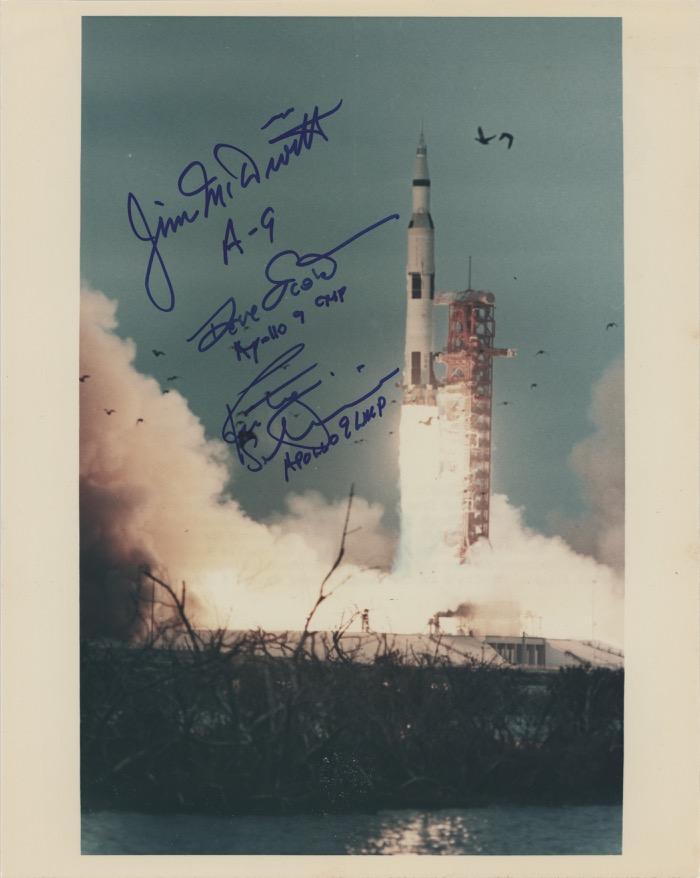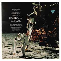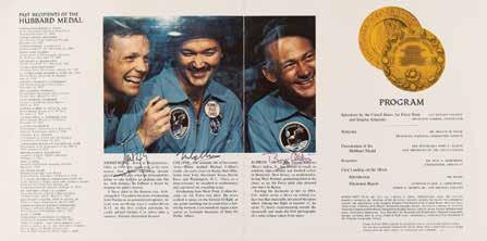 6082. Apollo 8 Crew-Signed Hubbard Medal Program. Appealing tri-fold program for the “Presentation of the National Geographic Society’s Hubbard Medal” to the Apollo 8 crew on April 3, 1969, 6.25 x 10, signed inside in black felt tip by Frank Borman, James Lovell, and Bill Anders. The Hubbard Medal is awarded by the National Geographic Society for distinction in exploration, discovery, and research: other recipients have included polar explorers like Robert Peary, Roald Amundsen, and Ernest Shackleton; aviators Richard E. Byrd, Charles Lindbergh, and Anne Morrow Lindbergh; and the 1954 British Mount Everest Expedition. In fine condition. Starting Bid $200