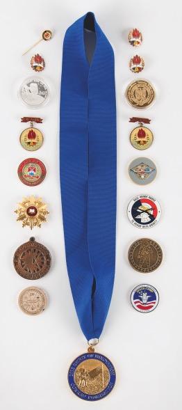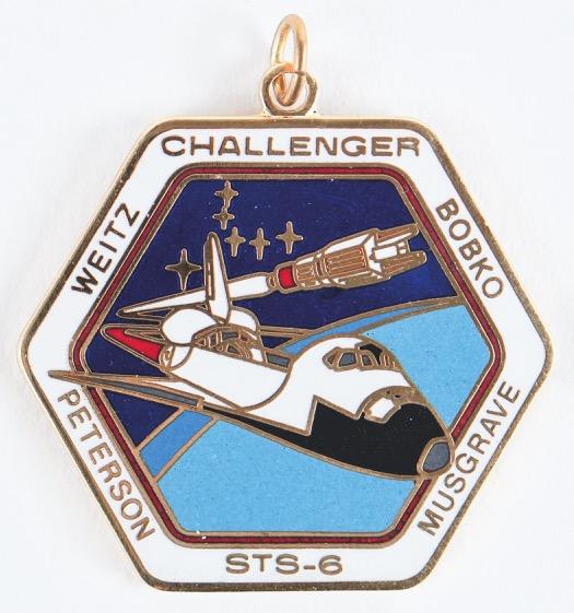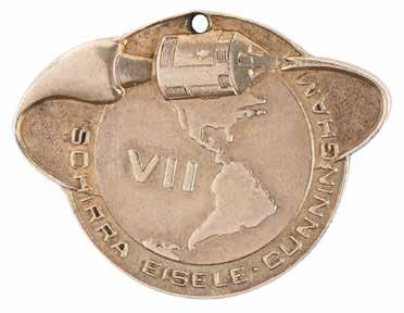 Two identical hexagonal 14K gold pendants carried aboard the Gemini SC6 spacecraft with astronauts Wally Schirra and Tom Stafford during the Gemini 6 mission. The front of each pendant is engraved with the mission’s insignia, and the reverse engraved with the launch date, “15 DEC 65.”