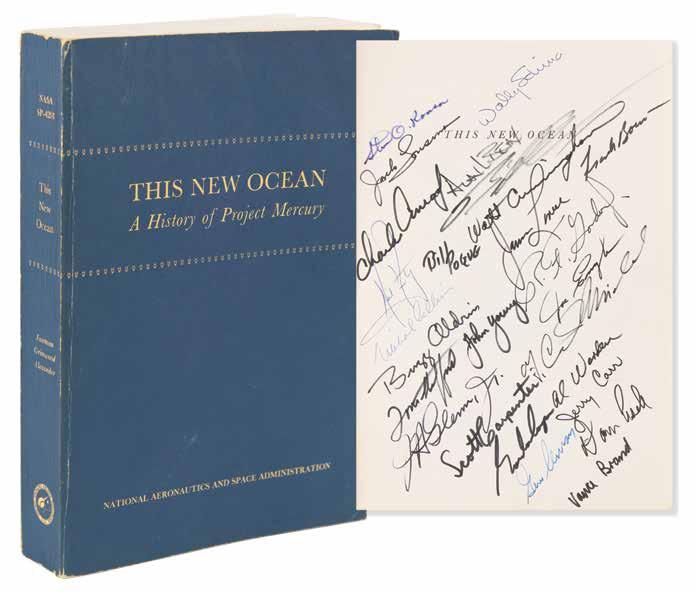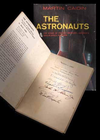 6007. Mercury 7 Signed Book - The Astronauts. Signed book: The Astronauts: The Story of Project Mercury, America’s Man-in-Space Program by Martin Caidin. Second printing. NY: E. P. Dutton & Co., November 1960. Hardcover with dust jacket, 5.75 x 8.25, 192 pages. Signed on the first free end page in various ink types by all seven Mercury astronauts: “Best wishes from the Mercury Astronauts — “Walter M. Schirra, Jr.,” “Donald K. Slayton,” “Alan B. Shepard, Jr.,” “Virgil I. Grissom,” “John H. Glenn, Jr.,” “Leroy G. Cooper, Jr.,” and “M. Scott Carpenter.” In very good to fine condition, with light irregular toning, a few small stains, and an affixed ownership sticker, to the signed page. Starting Bid $300
