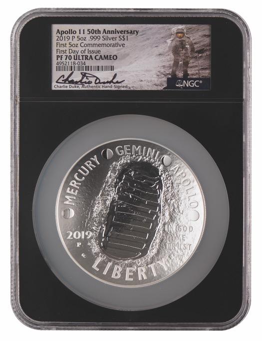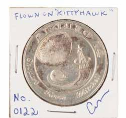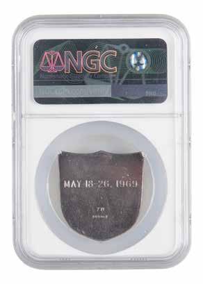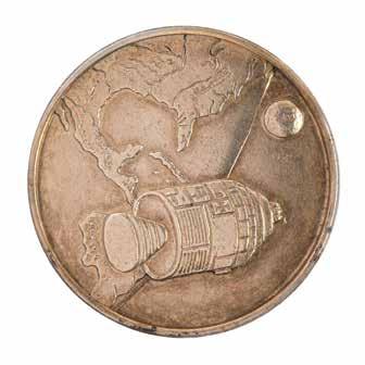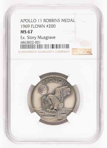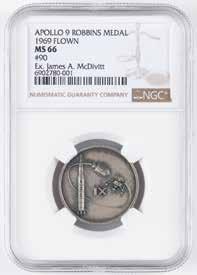 6097. Apollo 9 Flown Robbins MedallionNGC MS 66 - From the Personal Collection of Jim McDivitt. Flown sterling silver Apollo 9 Robbins medallion, approximately 1˝ in diameter, with a raised design of the mission insignia on the face—the orbiting CM and LM with Saturn V launch vehicle, and mission number “IX” at center. The reverse is engraved with the mission dates, “March 3–13, 1969,” and encircled by the surnames of the astronauts in raised text: “McDivitt, Scott, Schweickart.” The medal is serial numbered “90” and stamped below with the Robbins “Sterling” hallmark. Encapsulated and graded by NGC as “MS 66,” with the label noting the provenance, “Ex. James A. McDivitt.” Accompanied by its original case and a letter of provenance signed by McDivitt, in part: “This 1˝ diameter, sterling silver Apollo 9 Robbins Medallion was flown in Earth orbit aboard Apollo 9, 3-13 March 1969, and is from my personal collection.” McDivitt’s letter bears a PSA/DNA authentication label to the lower right corner. Starting Bid $300