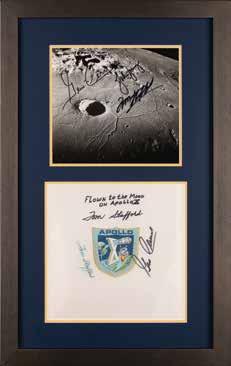 6105. Apollo 10 Flown Beta Cloth Patch with Crew-Signed Photograph. Fantastic flown 8.5˝ x 8.5˝ swatch of Beta cloth featuring the Apollo 10 mission emblem in the center, signed and flight-certified in black felt tip, “Flown to the moon on Apollo X, Tom Stafford” and “Gene Cernan,” with Stafford signing a second time in black ballpoint. Matted with an official glossy NASA lunar photo signed in black felt tip by the full crew: John Young, Gene Cernan, and Tom Stafford. Archivally framed together to an overall size of 14.25 x 22.75. In overall fine condition. The signed photo is accompanied by a certificate of authenticity from Farthest Reaches. An attractive flown piece from the important ‘dress rehearsal’ for the Apollo 11 moon landing, which is further augmented by the desirable presence of an uninscribed crew-signed lunar photo. Starting Bid $300