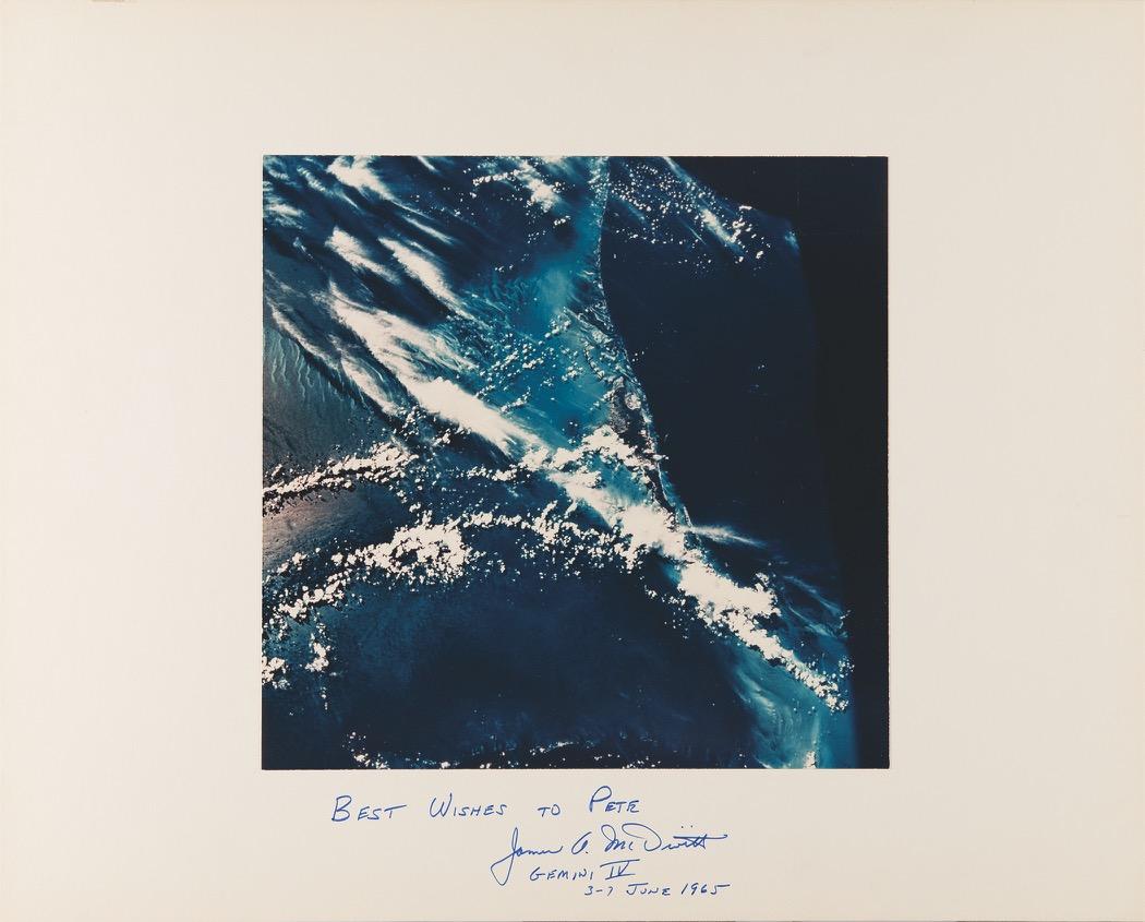 6037. Gemini 4 Flown American Flag - From the Personal Collection of Jim McDivitt. Uncommon flown fabric flag of the United States, 6 x 4, carried into space aboard the Gemini 4 capsule for a period lasting from June 3-7, 1965, signed and flight-certified in black ballpoint, “Flown on Gemini IV, Jim McDivitt.” In very fine condition. Accompanied by a certificate of authenticity signed by McDivitt, certifying that the flag “was flown onboard Gemini IV, June 3–7, 1965, and is from my personal collection.” Starting Bid $200