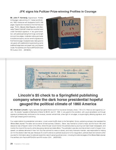 Lincoln’s $5 check to a Springfield publishing company where the dark horse presidential hopeful gauged the political climate of 1860 America 89. Abraham Lincoln. Highly desirable Springfield Marine and Fire Insurance Company check, 7.25 x 2.5, filled out and signed by Lincoln, “A. Lincoln,” payable to Bailhache & Baker for $5.00, April 21, 1860. In very good to fine condition, with usual cancellation cut through signature (professionally reinforced on the reverse), several vertical folds, a few light ink smudges, a couple slightly affecting signature, and some light creasing and trivial toning. Four weeks before his presidential nomination, Lincoln wrote this $5 check to the Springfield, Illinois, publishing company that operated the Illinois State Journal. The editor and co-owner of that business, Edward L. Baker, was married to Lincoln’s niece, and the future 16th chief executive was a frequent visitor to the office, where the pair would monitor the political press by pouring over East Coast newspapers, and monitor the mood of the country while discussing national and state affairs. The publication was also one that printed Lincoln’s Cooper Union speech, an address delivered in New York City that outlined his views on slavery, and many historians maintain, was responsible for helping win him the election later that year. Because of Lincoln’s silence on political issues prior to his inauguration, political observers looked to other sources for information about his attitude toward the nation’s growing political crisis—including the editorial pages of the Illinois State Journal. Pre-certified John Reznikoff/PSA/DNA and RR Auction COA.…(MB $1000)