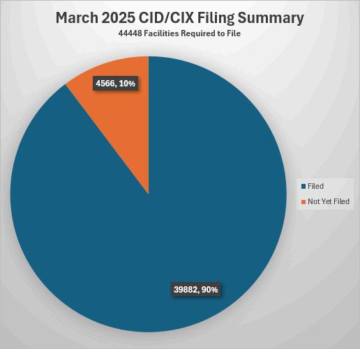 As of March 14th, a total of 39,882 facilities out of an available 44,448 filed a CID/CIX in the March 2025 filing session for a percentage of 90%.