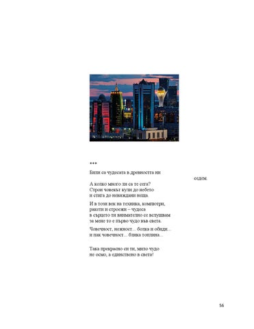 *** Били са чудесата в древността ни седем. А колко много ли са те сега? Строи човекът кули до небето и стига до невиждани неща. И в този век на техника, компютри, ракети и строежи – чудеса в сърцето ти внимателно се вслушвам за мене то е първо чудо във света. Човечност, нежност... болка и обиди... и пак човечност... блика топлина... Така прекрасно си ти, мило чудо не осмо, а единствено в света!