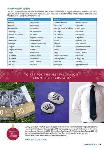 Branch Awards update The RSCDS presents Branch Awards to members who make a contribution in support of their local branch, and once again a number of individuals have been honoured. Listed below are all those members who have received awards since October 2015 – congratulations to you all! BRANCH