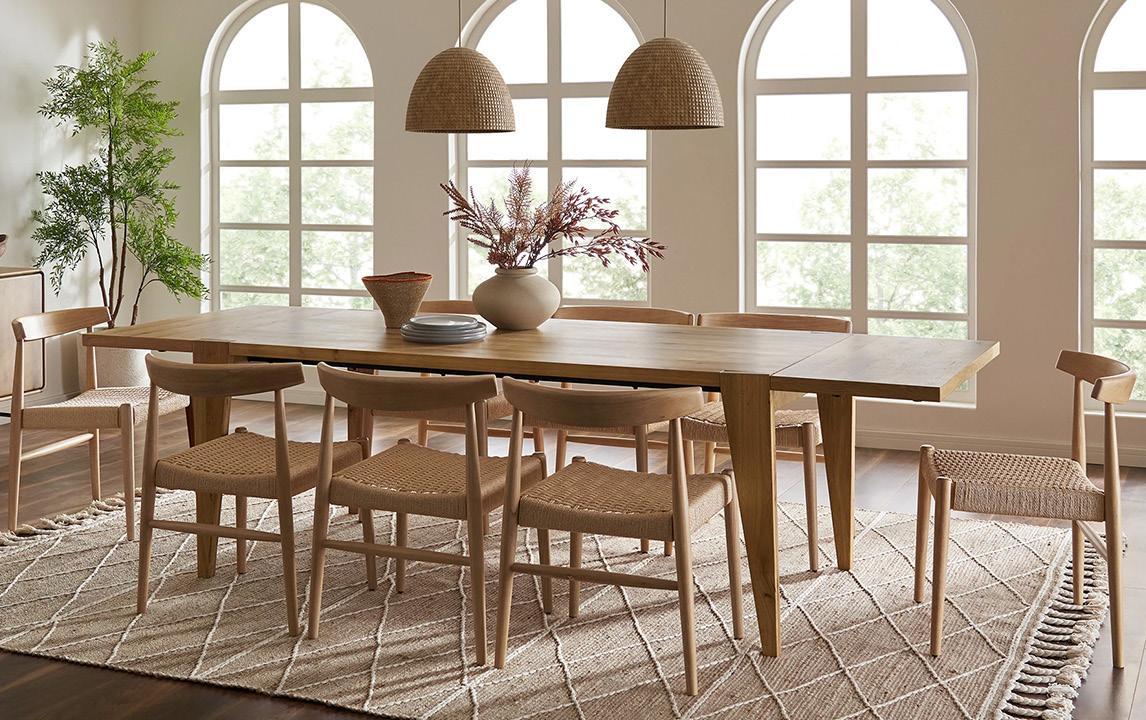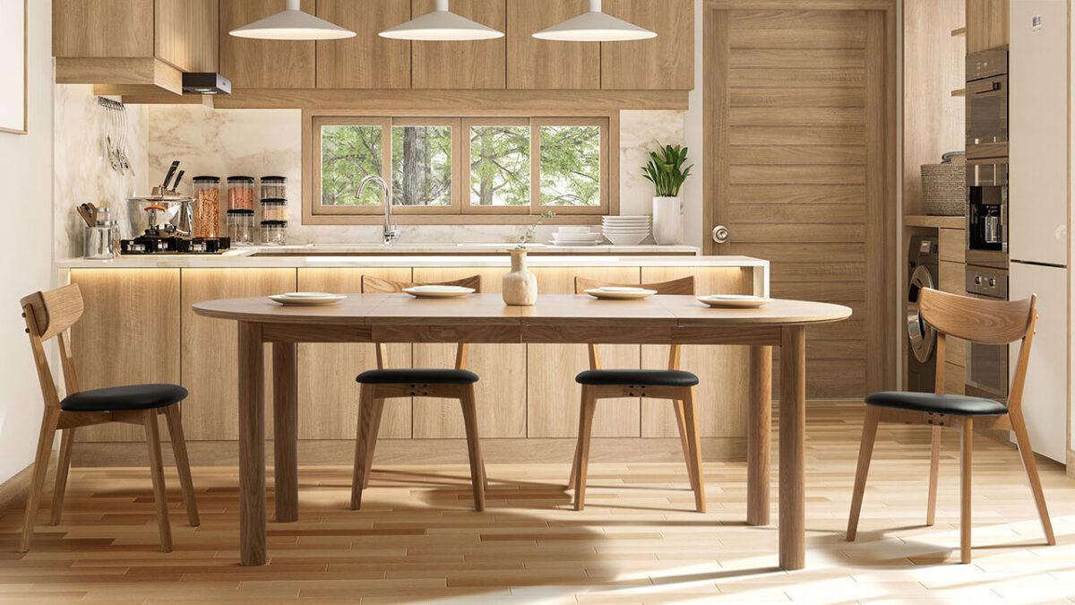 Si tienes espacio, una mesa más grande con capacidad para seis u ocho personas (y extensible a 10 o 12) te ofrece flexibilidad para comidas familiares numerosas o reuniones festivas. Solo asegúrate de dejar al menos 90 cm alrededor de la mesa para moverse con comodidad y que las sillas se puedan deslizar fácilmente.