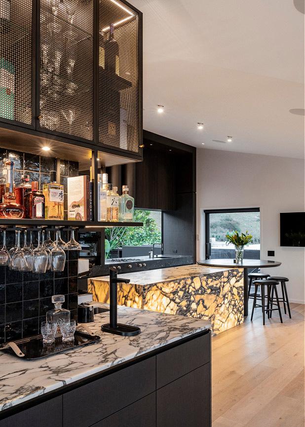 Molnar añadió un centro de bebidas envolvente de estilo cóctel para café y bebidas alcohólicas. Este cuenta con una estructura de acero fabricada a medida, esquinas exteriores curvas, tiradores de latón ennegrecido, azulejos marroquíes cortados a mano y paneles tejidos Archant en los gabinetes superiores.
