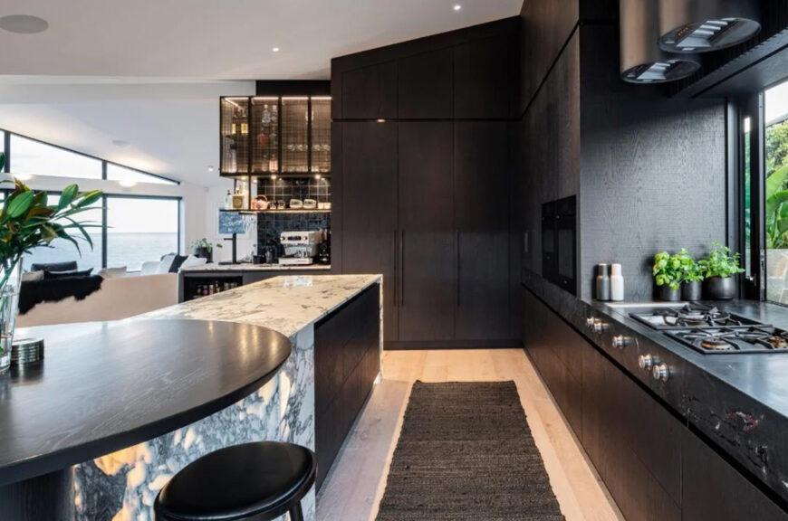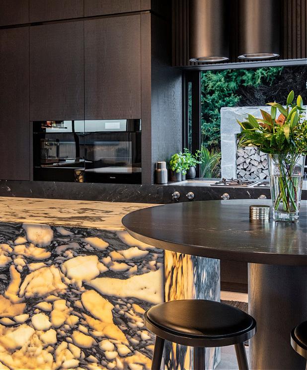 “Por la noche, la cocina experimenta una transformación cautivadora, iluminada por 50 metros de iluminación LED integrada en los paneles de mármol”, afirma el diseñador. “Estos proyectan un brillo suave y etéreo que acentúa el mármol Arabescato”.