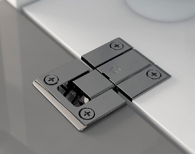 Para puertas tipo secreter o baúl, se recomiendan bisagras planas como la Kimana, con un movimiento exclusivo que permite la apertura incluso cuando el gabinete cuenta con paneles decorativos o de iluminación. Su diseño con ajuste tridimensional garantiza una integración estética perfecta, manteniendo la continuidad visual del frente con la superficie del mueble.