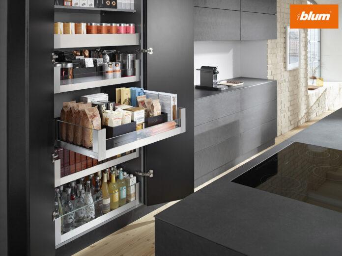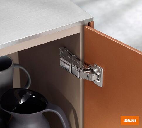 Cada mueble cumple una función específica y suele integrar distintos herrajes en su interior. Por ello, la elección de la bisagra adecuada dependerá también del mecanismo interno. Un ejemplo es la torre de despensa Space Tower de Blum, que incorpora cajones interiores. En este caso, se requiere una bisagra de 155° sin obstrucción, que permite abrir completamente el frente para el libre deslizamiento de los cajones. Además, puede complementarse con sistemas TIP-ON (apertura por presión) o BLUMOTION (cierre suave y silencioso), tecnologías que aportan precisión y confort en el uso diario.