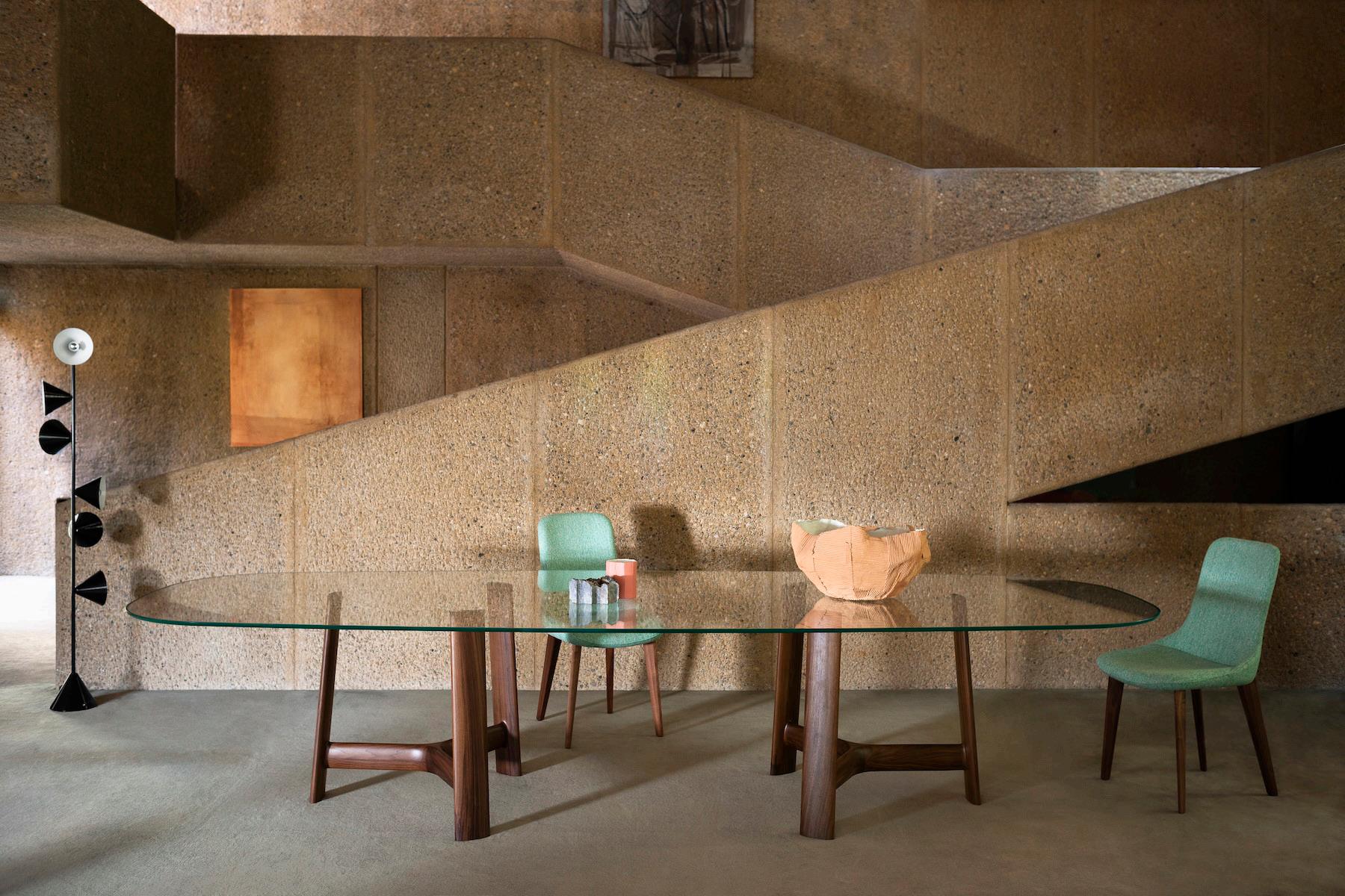 La parte superior ovalada, si se elige en la versión de vidrio, resalta el elegante marco de la base y sus meticulosos detalles de unión. Ademar, por otro lado, confía su singularidad estética a la tapa: circular o elipsoidal, en roble o mármol, tiene un perfil de grosor variable, creando un delicado movimiento a lo largo del borde, mientras que las patas inclinadas y ahusadas la sostienen en una continuidad de diseño lógica.