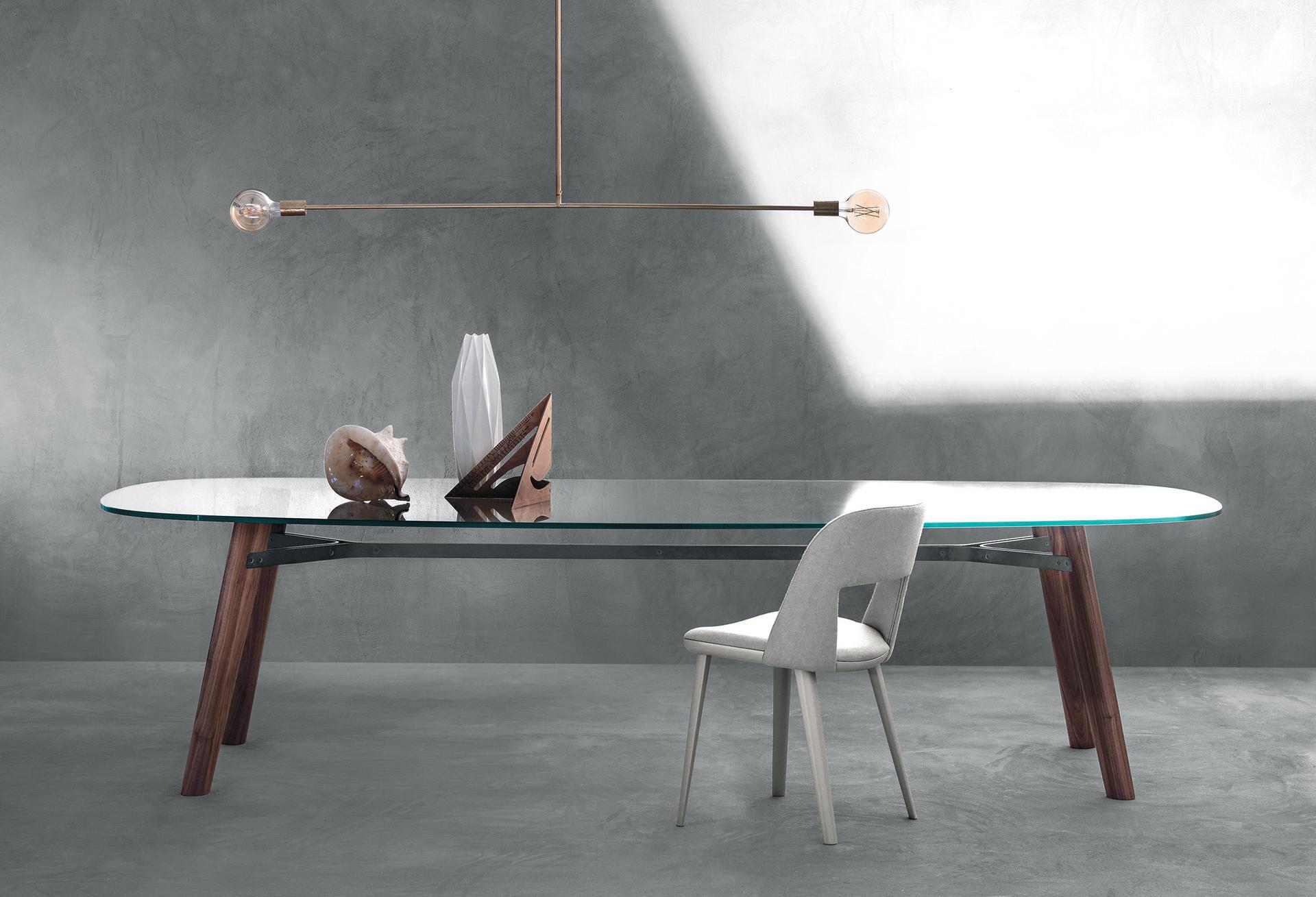 Beleos table with American walnut structure and glass top. The collection is designed by Giulio Iacchetti. Ph: Studio Eye