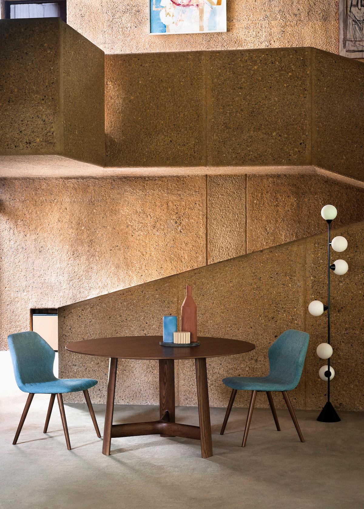 Aretha, diseñada por Monica Armani, es una composición sofisticada de geometrías y acabados. La base es una columna central ligeramente acampanada que consta de dos secciones: una porción inferior - elaborada en madera de fresno natural, teñida o lacada, o en varios tipos de piedra natural - y una porción tapizada en tela técnica, disponible en diferentes tonos. La superficie superior, con un diámetro de 140 o 160 cm, se corresponde con la estructura y refleja su estilo, con madera o una superficie cerámica completa.