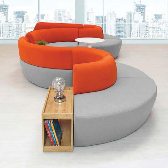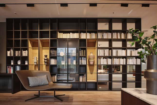 Bajando las escaleras hasta el mezzanine, se accede al último espacio del showroom donde el sofá Neil de Francesco Rota recrea un foso de conversación contemporáneo, un espacio dedicado al intercambio de palabras y emociones, una clara invitación a compartir. Perfecta síntesis de la idea de confort a medida, el sofá modular Neil destaca por su asiento mullido, formas generosas y líneas cuadradas de respaldo y brazos que, ligeramente inclinados hacia el exterior, subrayan la sensación de acogida y confort. Las líneas geométricas del sofá son retomadas por Mansions, la mesa de centro que hace del movimiento de su cubierta una eficaz herramienta expresiva. Diseñada por Christophe Pillet, esta mesita se caracteriza por una base ligera de metal pintado bronce a la que se solda un depósito rígido que cumple función de contenedor y soporte. Completa el ambiente la librería Booken de Raw Edge, la librería que apuesta por el libro como objeto decorativo, protagonista activo del sistema de librerías.