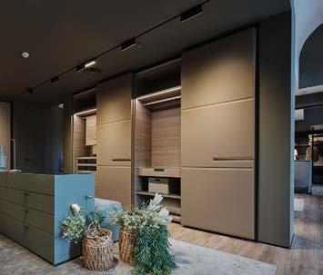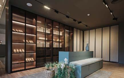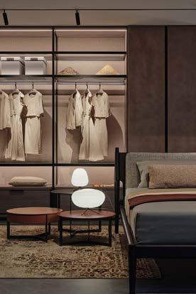 Un segundo acceso, situado en el lado opuesto al principal al que se accede desde el interior del centro comercial que alberga el showroom, da paso a una primera propuesta de zona de noche. El espacio está delimitado por los closets Armadio al Centimetro: Dandy, Text y Open diseñados por Officinadesign Lema. Los tres muebles se alternan, una síntesis perfecta entre modularidad y estética, dando testimonio de la alta capacidad de personalización de la firma italiana, que ve en la colección de Armadio al Centimetro su máximo exponente. Dandy tiene un carácter de diseño sofisticado, mientras que Text revela su personalidad en el corte largo que recorre toda la altura de las puertas y que actúa al mismo tiempo como jaladera. Open en cambio, como su propio nombre indica, es una solución completamente “visible”: abierta por el frente, sin puertas, que se adapta a cualquier tipo de espacio, revolucionando los patrones de habitabilidad tradicionales.
