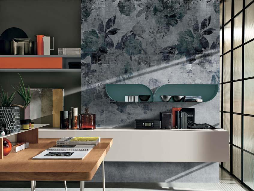 Las estanterías, también modulares, y los organizadores de pared visten el espacio junto con librerías de suelo o de pared, junto con encimeras que se pueden declinar según el diseño y las necesidades del interior.
