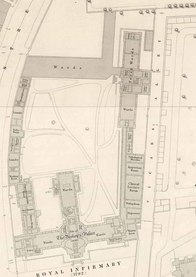The central wing projecting north was added in 181415, containing a staff dining-room, accommodation, and additional wards for about 80 patients. A detached fever block, constructed in 1828-29 to the north-east, became attached to the main building in 1842 by constructing a large Clinical Lecture Room, Waiting Room, Dispensary, Inspection Room and a Pathological Museum. The western wing, built around 1839, included the Superintendent’s House, Boiler House, and washing and drying rooms.