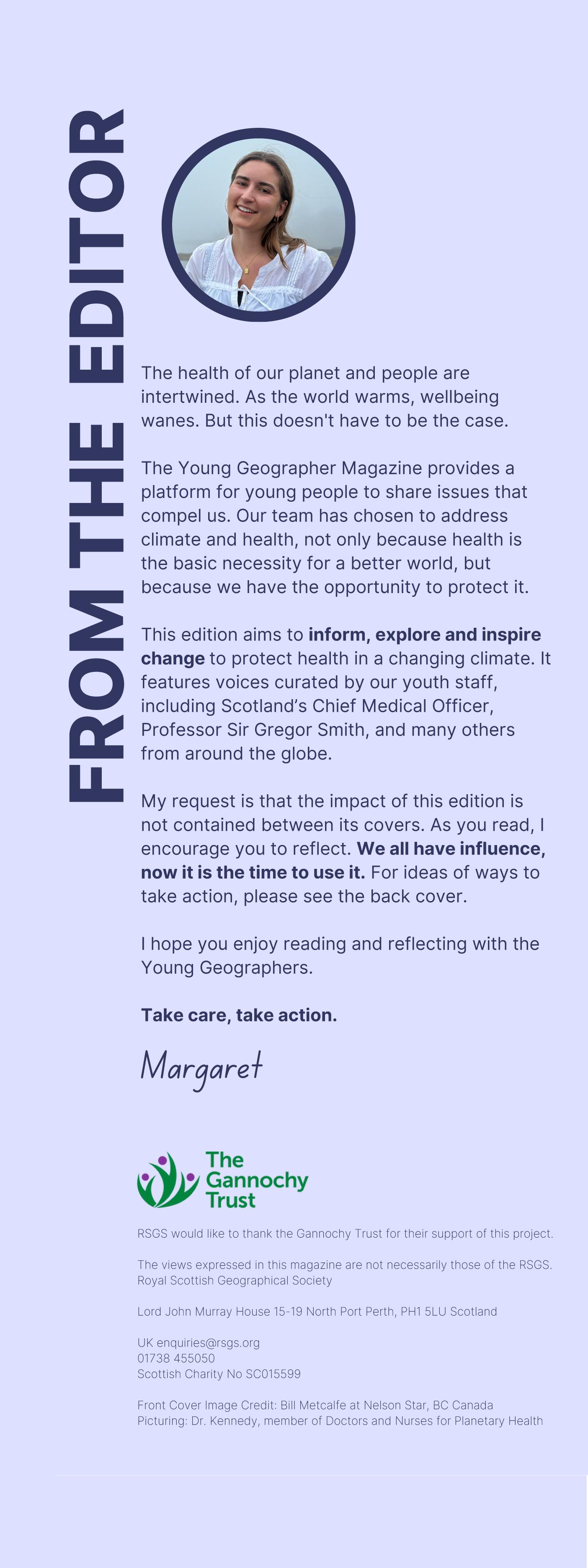 The Young Geographer Magazine provides a platform for young people to share issues that compel us Our team has chosen to address climate and health, not only because health is the basic necessity for a better world, but because we have the opportunity to protect it