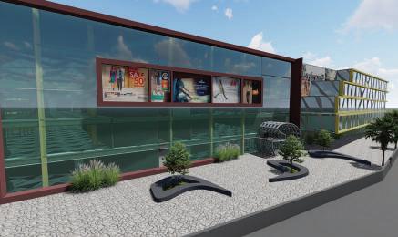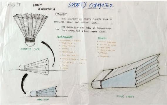 This sports complex facade theme was inspired by the shape of shuttle cock By using the elements of shuttle cock to developed facade treatment like ,diagonal brassed curtain wall etc...