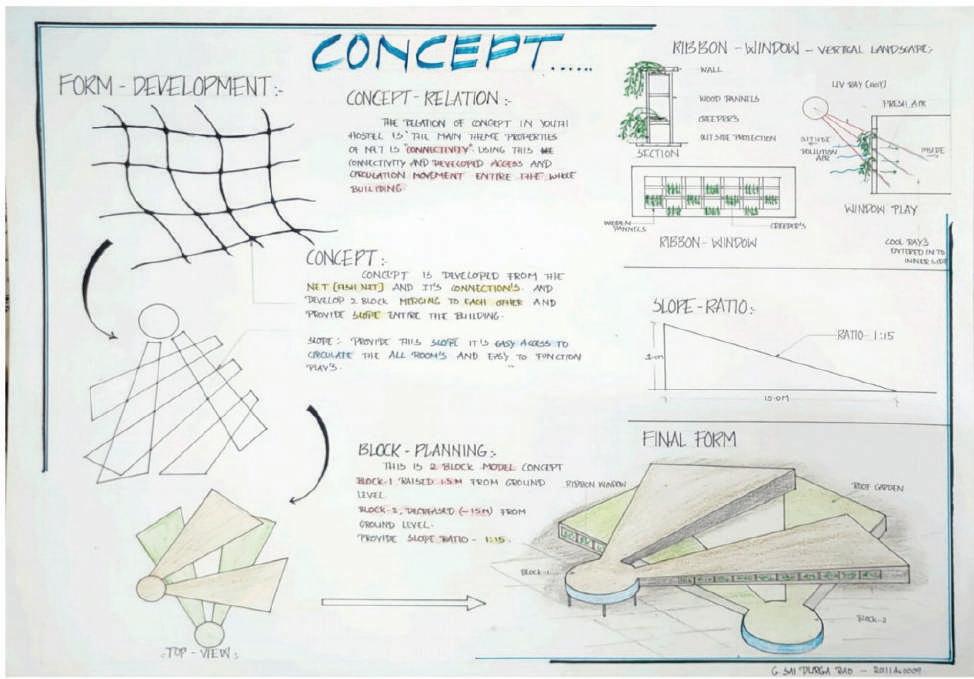 1.The concept is developed from the NET CONNECTIONS form developed merging of 2 blocks using SLOPE and designed nal form of building