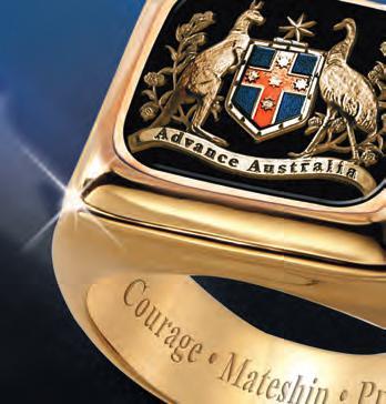 The ring showcases a host of uniquely Australian elements in an exclusive design guaranteed to make you feel proud. A traditional Australian coat of arms overflows with rich sculptural details including the stirring words ‘Advance Australia’. Vibrant hues of red and blue enamel and genuine black onyx are accentuated magnificently by the generous 24-carat gold plate. Each side features the year 1788 in honour of Australia’s founding. The inner band is etched with the words Courage • Mateship • Pride, attributes which have defined Australian men for over two hundred years.