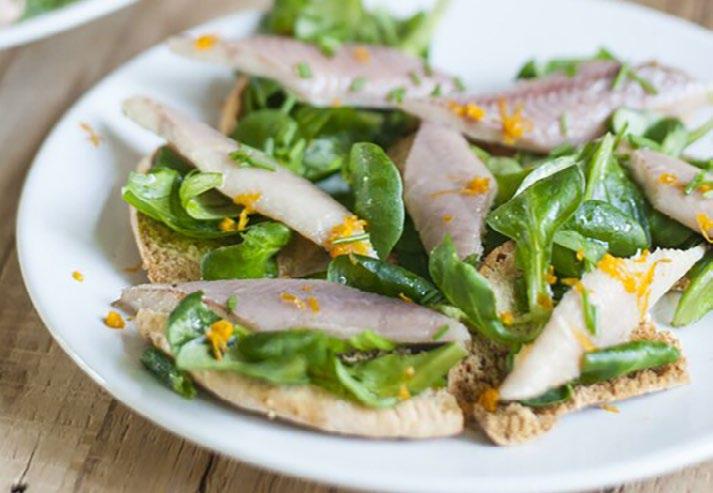 Lekker met boerenbruinbrood bij met citroenboter; boter gemengd met citroenrasp, peper en knoflook.