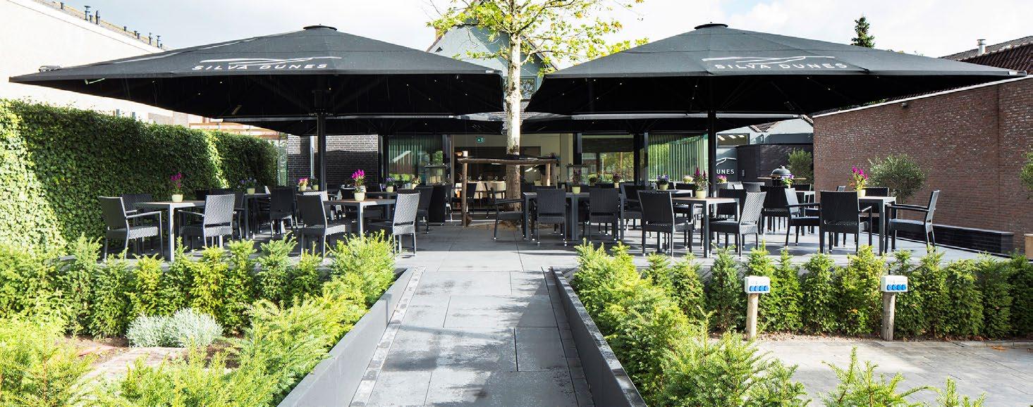 Het terras aan de voorkant is mediterraan ingericht met helderwit gedekte tafels. Platanen en parasols zorgen voor schaduw en grote plantenbakken onttrekken het uitzicht op het parkeerterrein.