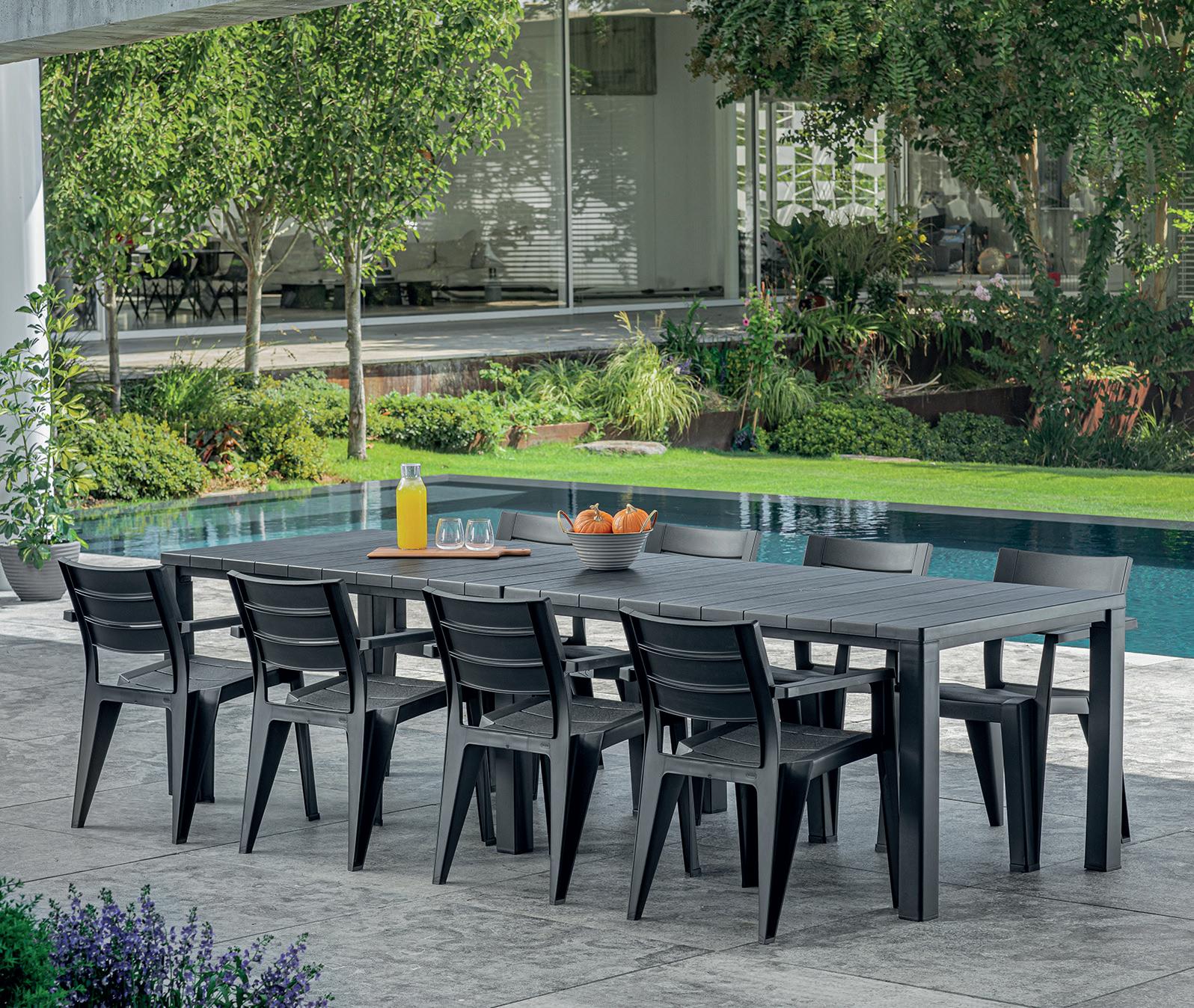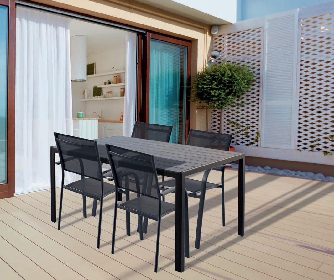 Estructura de aluminio color negro con sobre en lamas de polywood color negro 150 x 90 cm.