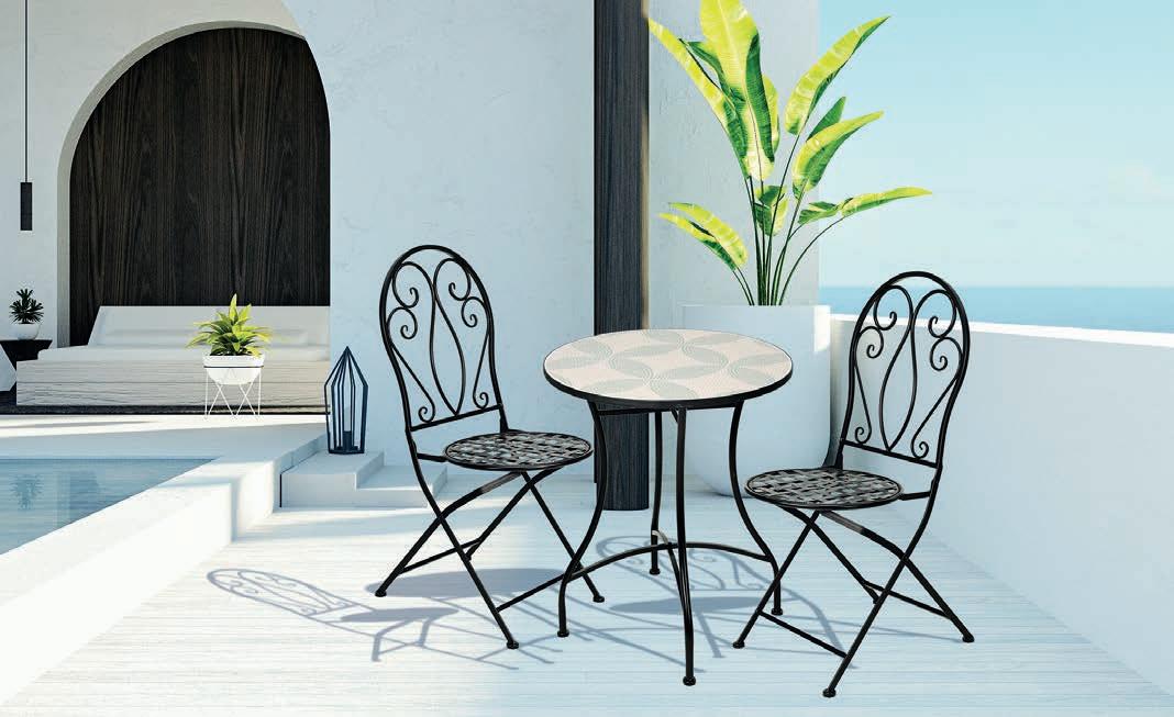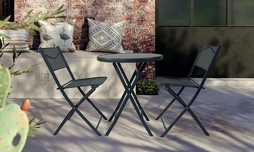 CONJUNTO MESA ACERO + 2 SILLAS PLEGABLES 23003776 Mesa acero con sobre cristal Ø60xH70 cm. Sillas 46x51x81 cm. Textilene color gris. 79’95