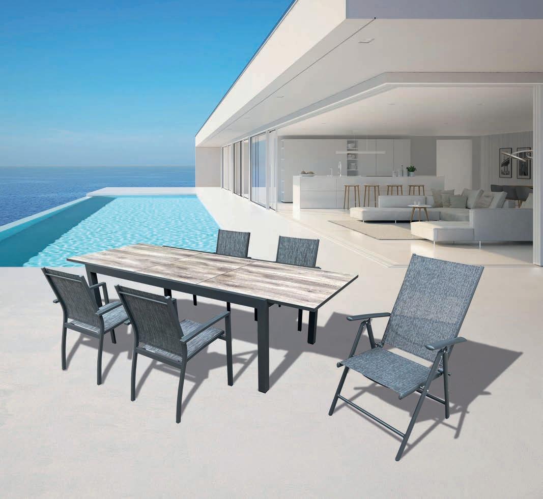 Aluminio color gris antracita y textilene gris jaspeado. 49’95