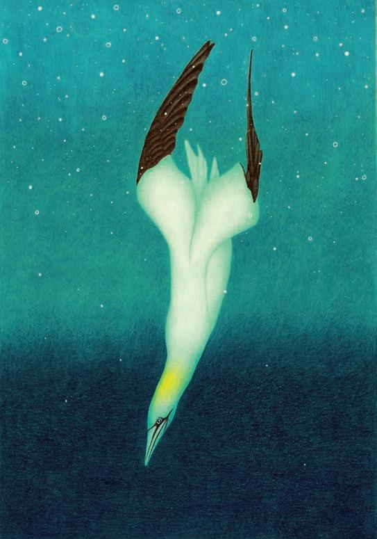 Two years later. Catching sight of a daggerGannet plunging into the sea from a cloudless blue sky filled with the hope of dark-eyed resilient birds, youngsters and pairs prospecting nest sites. Morus bassanus is returning home.
