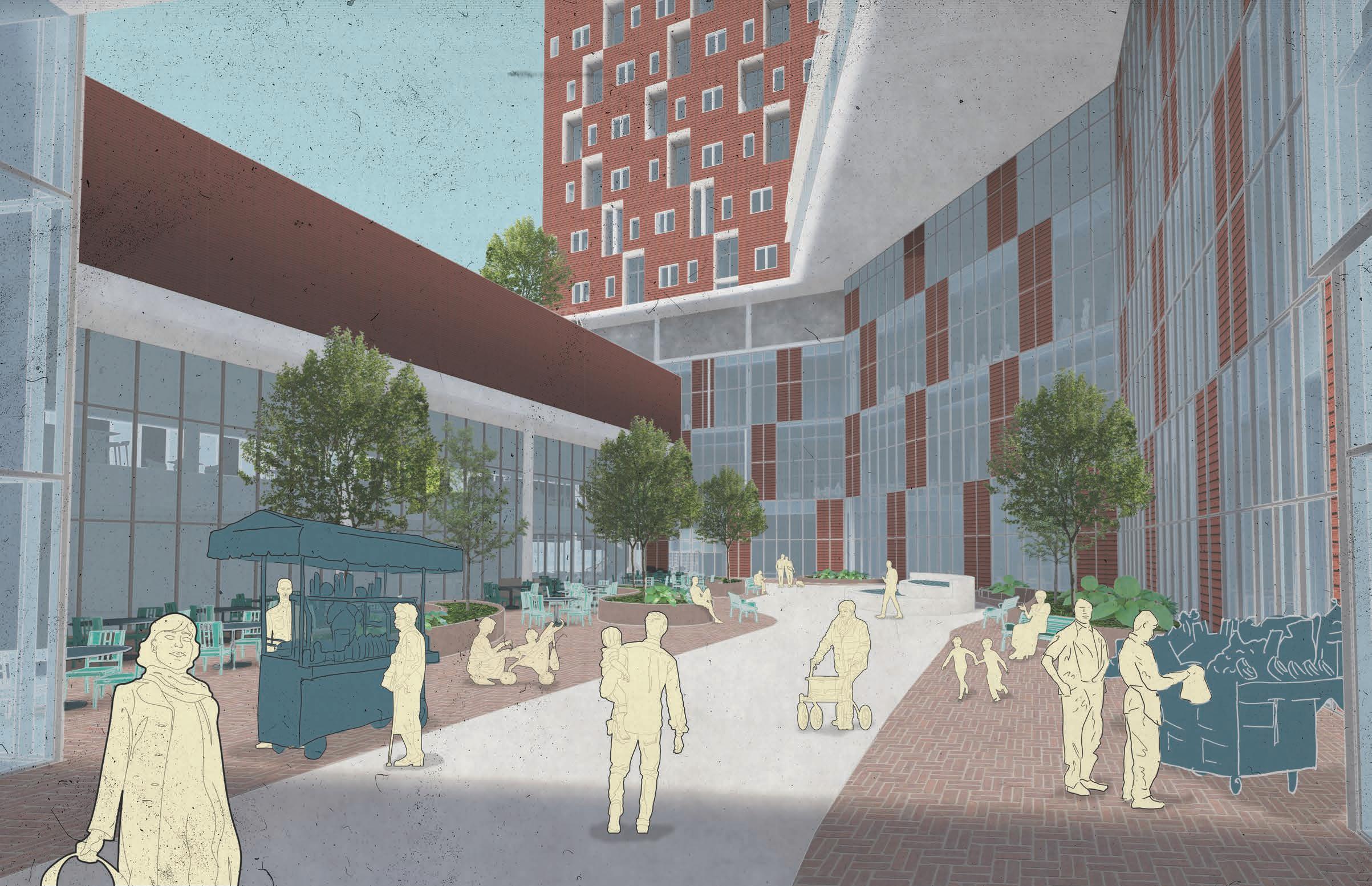 I worked together with my partner to develop the larger site and research the surrounding community. I personally completed the final diagrams, including master plan, plans, and sections. We worked together to create the renders, using my hand drawn entourage to tie together the different scenes.