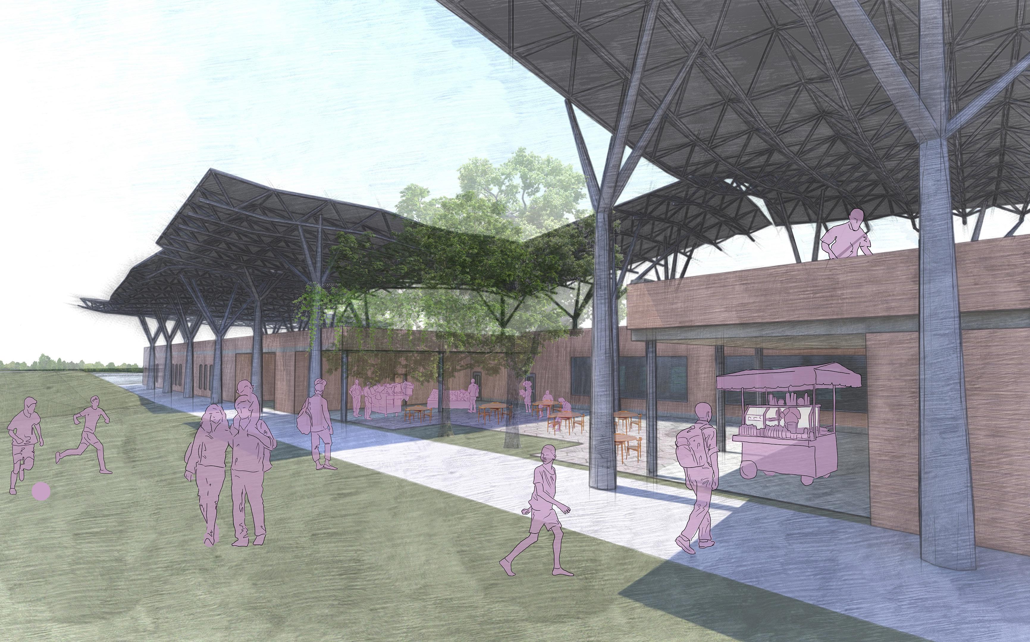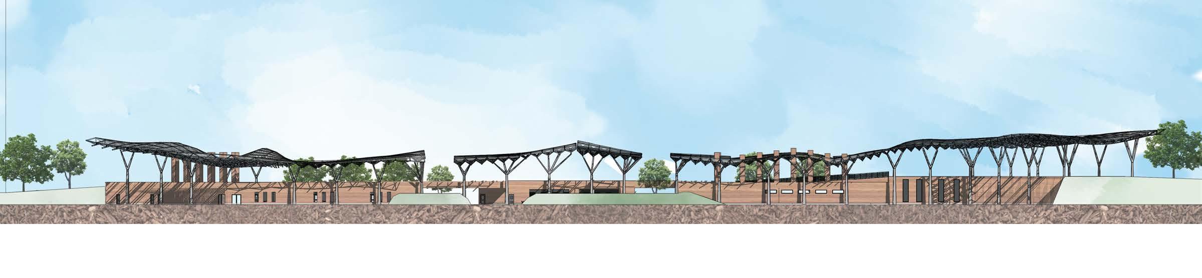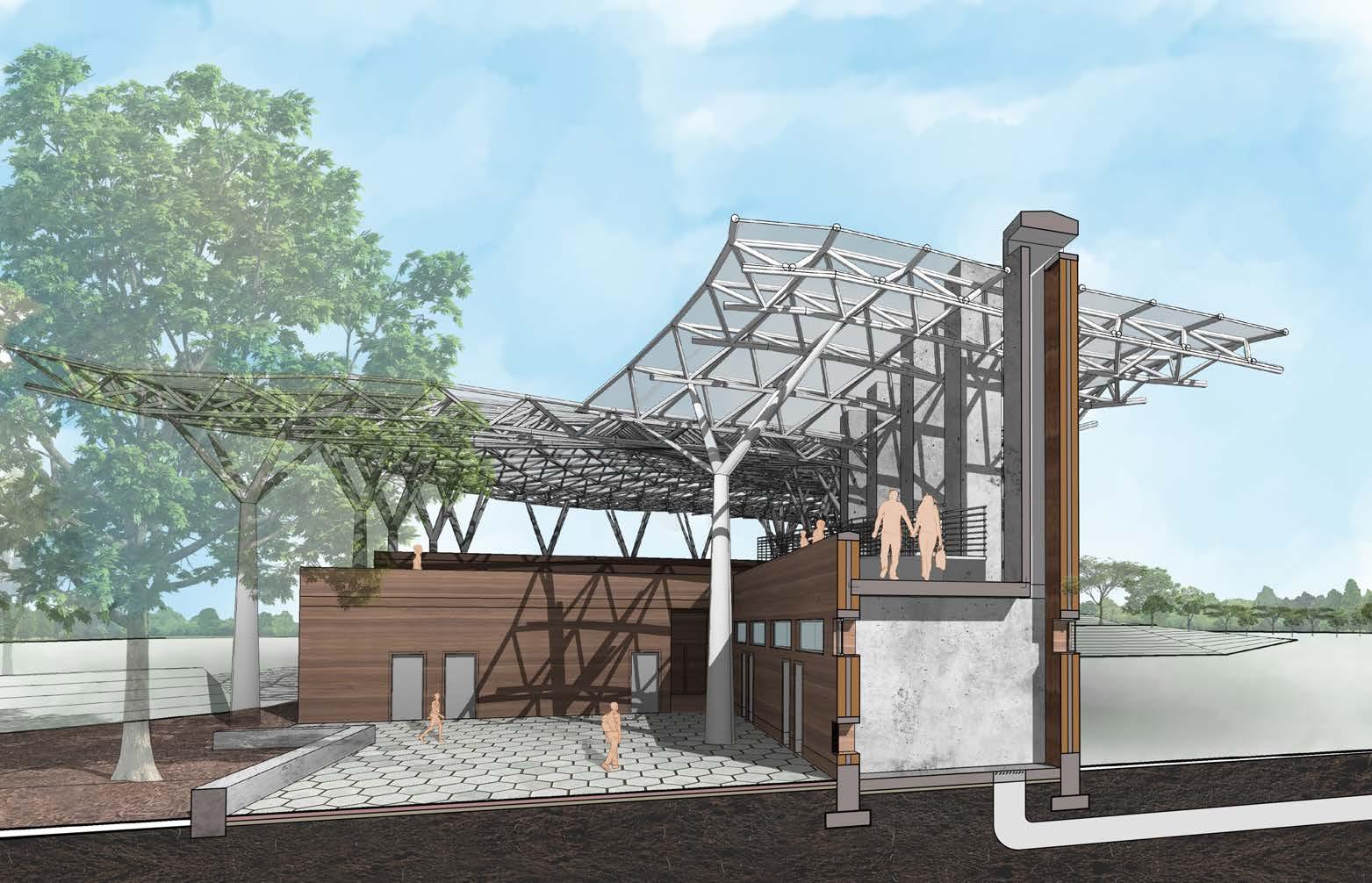 The canopy covering the entire complex is designed with tree columns to mimic the natural tree canopy, while the PV panels take advantage of the sun to produce energy for the project.