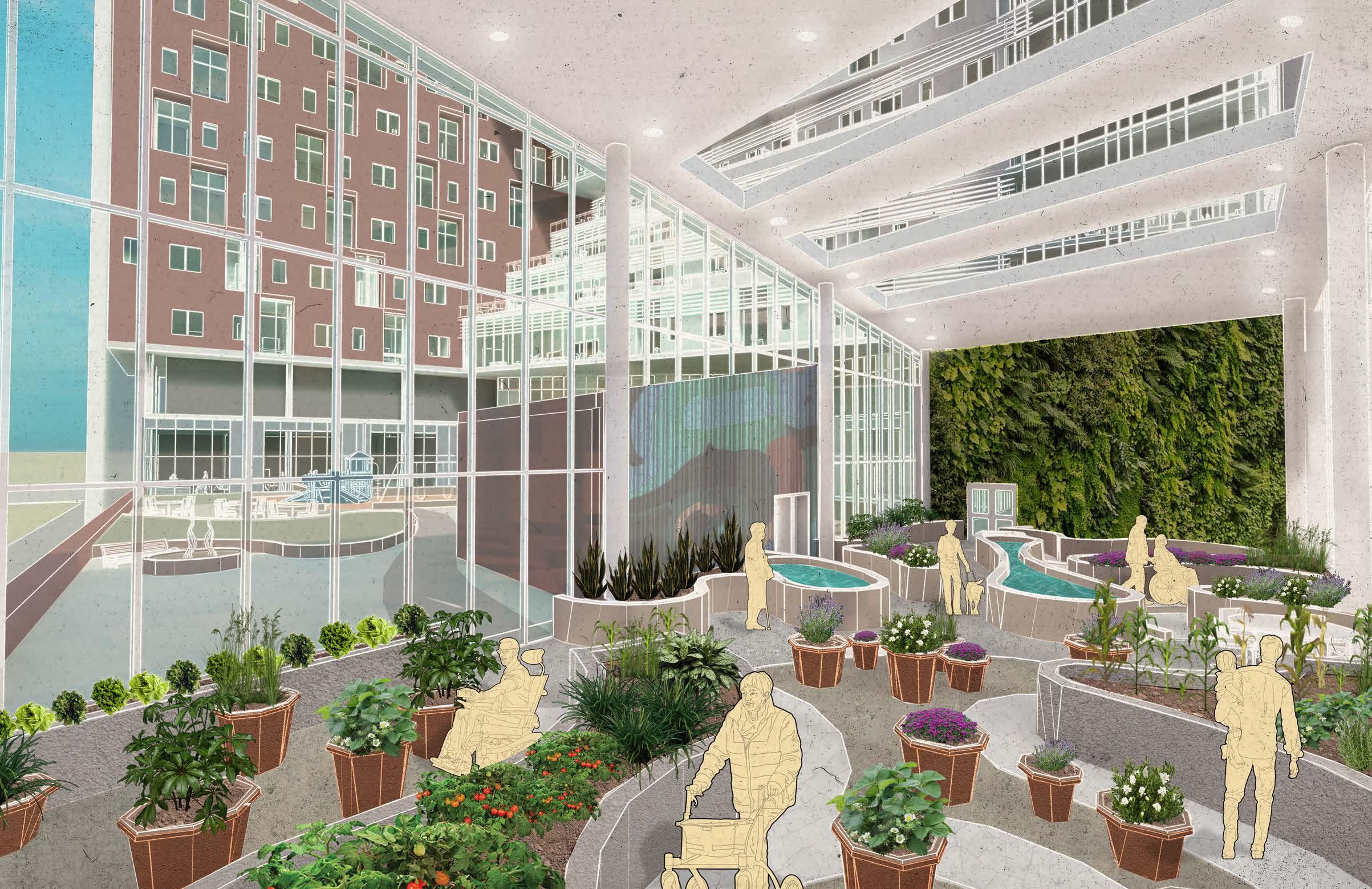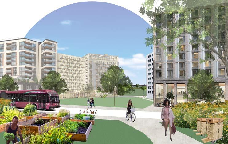 Adjacent to taller mixed-use buildings, the green spaces become more public and visible. Community gardens provide resources for a larger set of residents, rather than