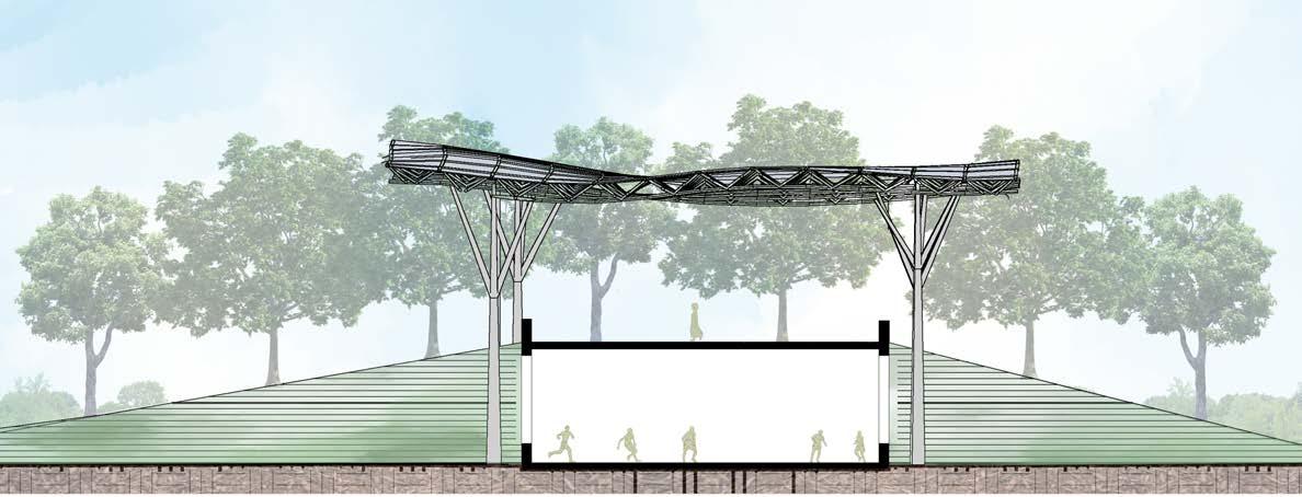 The public spaces are concentrated along the main north road, with trees and berms helping to create privacy to the academy but not excluding locals from using the space. The southern leg of the site is covered in tree canopy and includes small agriculture plots to be used for horticultural therapy and food for the academy. The H+W Center combines both active and peaceful activities to unite the two parts of the site.