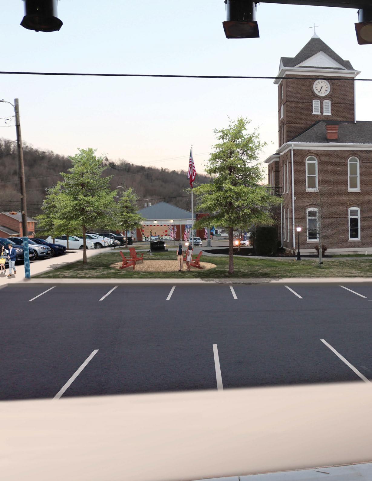 Simplifying this parking area by relocating spaces to the street could significantly expand downtown greenspace and provide areas for sidewalks and street trees. This concept also shows sidewalks extended up Smith Avenue to connect with the Meigs County Historical Society.