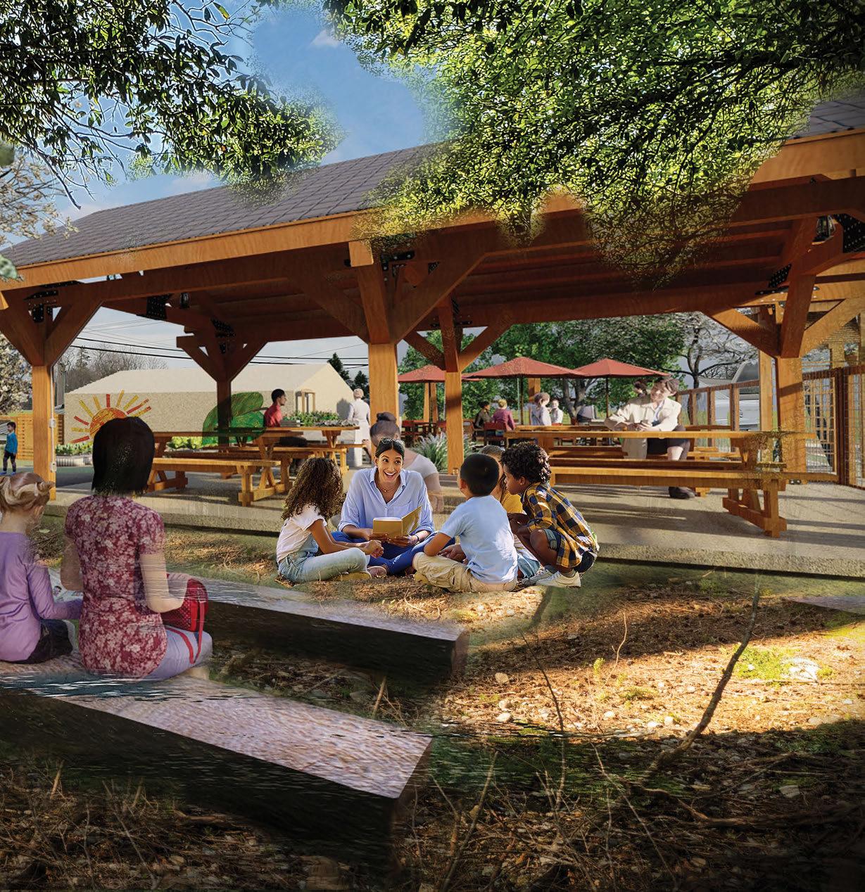 OUTDOOR AREA AND EDIBLE LANDSCAPE, PROPOSED: This outdoor seating area overlooks a vibrant edible landscape with raised garden beds, creating a relaxing space for parents to enjoy a book while watching their children play at the nearby climbing dome and berm. A whimsical, Eric Carle-inspired mural of a caterpillar adds color and charm to the wall of the existing shed. The garden beds are located next to the shed for convenient access to tools and equipment. These raised beds are designed for gardeners of all abilities. Surrounding the pavilion, plantings of ornamental grasses, fragrant herbs, and purple cabbage add texture, color, and seasonal interest.