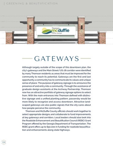 G AT E WAY S Although largely outside of the scope of this downtown plan, the city’s gateways and the Main Street/US-78 corridor were identified by many Thomson residents as areas that must be improved for the community to reach its potential. Gateways are the first and last opportunity a community has to communicate its values and unique sense of place. The purpose of gateway signage is to announce the presence of and entry into a community. Through the assistance of graduate design assistants at the Archway Partnership, Thomson now has an attractive portfolio of gateway signage options to select from. With the main entrances into Thomson defined with distinctive signage and a unified planting pattern, passersby would be more likely to recognize and access downtown. Attractive landscaped gateways are also public signals that the city cares about how people perceive the community. Thomson and McDuffie County officials should work together to select appropriate designs and collaborate to fund improvements at key gateways and corridors. Local leaders should also look into the Roadside Enhancement and Beautification Council (REBC) Grant Program offered by the Georgia Department of Transportation. The REBC grant offers up to $50,000 in funding for roadside beautification and enhancements along state highways.