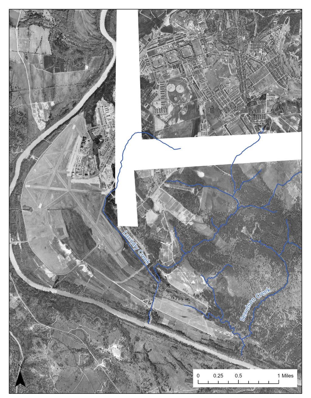 Laundry Creek originates near Eubank Field and the historic parachute jump towers and enters Lawson Army Airfield just west of Red Ramp, crossing under Jecelin Road.