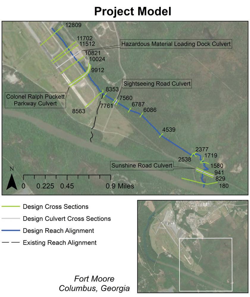 location against the Chattahoochee River, the airfield is site to many cultural and ecologically important areas. One of those areas, Laundry Creek, was rerouted into a concrete channel to make room for runway expansion. Today, the current structure that the creek runs through routinely exceeds capacity during rain events, jeopardizing airfield operations due to flooding. Restoring Laundry Creek to a more natural channel would not only mitigate this flooding issue but would also provide enhanced biological benefits in this area of the installation.