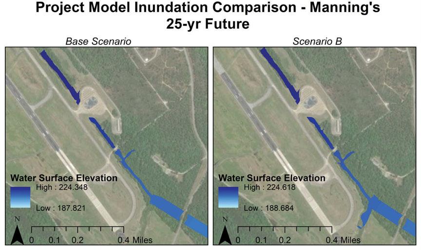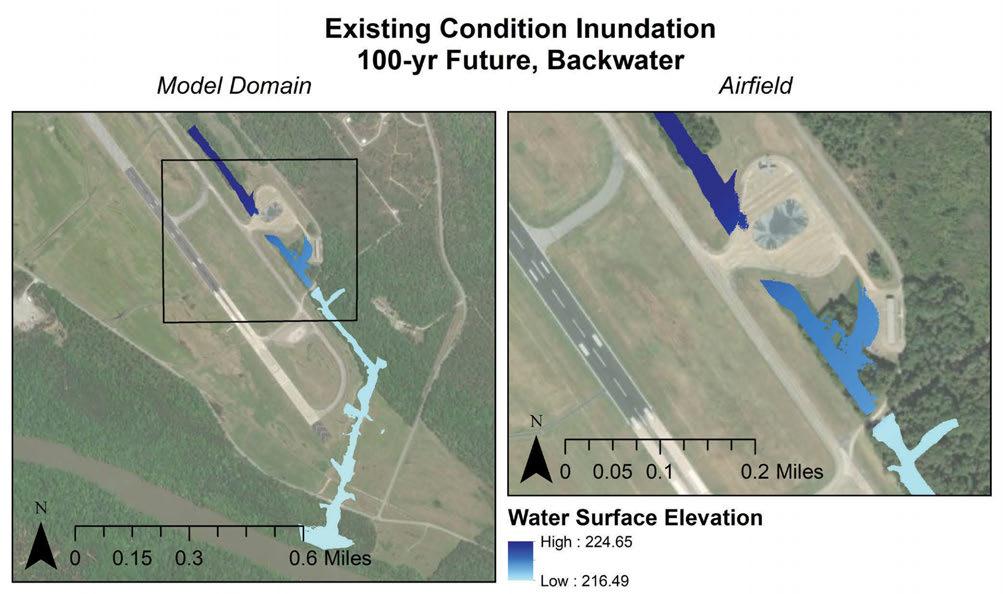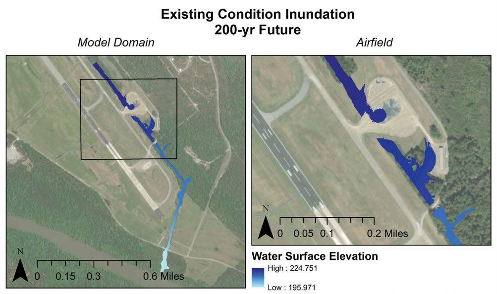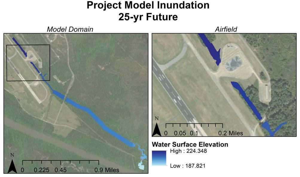 This report and study indicate that the restoration of Laundry Creek is a feasible alternative that can potentially deliver flood risk reduction and net environmental benefits under future climate and land use change scenarios at a reduced cost versus conventional, gray infrastructure approaches. The preliminary concept design, informed by in depth hydrologic and hydraulic analyses, demonstrates that the EWN solution includes potential flood mitigation, less airfield and training downtime, the enhancement of ecological function, and water quality improvement. By integrating natural and engineered solutions, the project offers enhanced sustainability and resilience against the