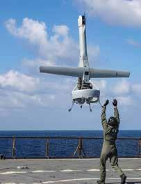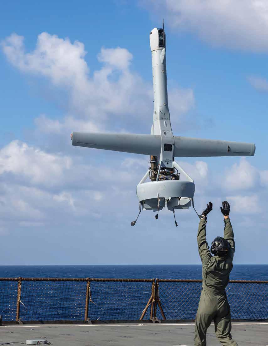 A V-BAT uncrewed aerial system launches from the dock landing ship USS Carter Hall during operations in the Mediterranean Sea, Feb. 9, 2024. The V-BAT provides the capability to increase maritime awareness through the utilization of intelligence, surveillance, and reconnaissance sensors.