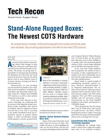 current trend in military system design reflects both changes in what exploration prime contractors need from their er your goal subcontractors and overall trends in eleceak directly tronics. The primes are giving more rel page, the resource. sponsibility to subcontractors by pushing chnology, the definition of COTS from the board and products level to the box level. That way, the prime Figure 1 doesn’t need as many different types of ed Much of the consolidation in compute in-house expertise, turning over more to platforms is occurring in stand-alone the subcontractor. rugged boxes used for ground vehicles, Subcontractors are now providing not just board-level products, but standsuch as Humvees and tanks. In Dibbis, alone box-level products, including data Iraq, a member of Company C, 96th Civil panies providing solutions now acquisition and processing systems, lapAffairs Battalion, maintains security ration into products, and companies. your goal is to research the latest tops,technologies tablet PCs, displaysWhether and handheld from the turret of a Humvee while lication Engineer,LCD or jump to a company's the goal of Get Connected is to put you monitors, as technical well aspage, more systems inspecting abandoned buildings slated ice you require for whatever type of technology, andfor.testing. ies and productsintegration you are searching for conversion to barracks for members At the same time, advances in elecwww.cotsjournalonline.com/getconnected of the Iraqi Civil Defense Corps. Photo by tronics technology are combining with Sergeant April Johnson, courtesy of U.S. Army. an increase in the adoption of open standards to help consolidate what used to be multiple, separate computers or boxes into just one or two. This is occurring or shipboard radar/sonar sensors and unin the mobile battlefield control and in- manned aerial vehicles (UAVs). formation systems in ground vehicles (Figure 1). Other environments include Smaller, Denser Systems Analyze missile-guidance systems, ground-based More Data Much of the push behind this trend comes from the current war effort. Size, Get Connected weight and power, as well as gigaflops per with companies mentioned in this article. watt, are two main drivers, says Joey Selwww.cotsjournalonline.com/getconnected vin, partner development director for Mer-